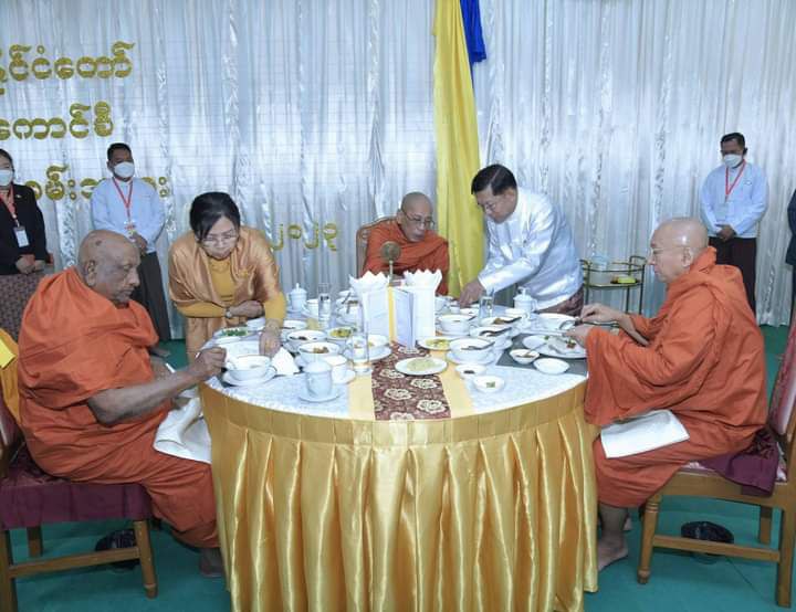 ၂၀၂၃ ခုနှစ် ၊ သာသနာတော်ဆိုင်ရာ ဘွဲ့တံဆိပ်တော် ဆက်ကပ်ခံယူတော်မူမည့် ဆရာတော်ကြီးများအား နိုင်ငံတော်စီမံအုပ်ချုပ်ရေးကောင်စီဥက္ကဋ္ဌ နိုင်ငံတော်ဝန်ကြီးချုပ် ဗိုလ်ချုပ်မှူးကြီး မင်းအောင်လှိင်နှင့်ဇနီး ဒေါ်ကြူကြူလှတို နေ့ဆွမ်းဆက်ကပ်လှူဒါန်း