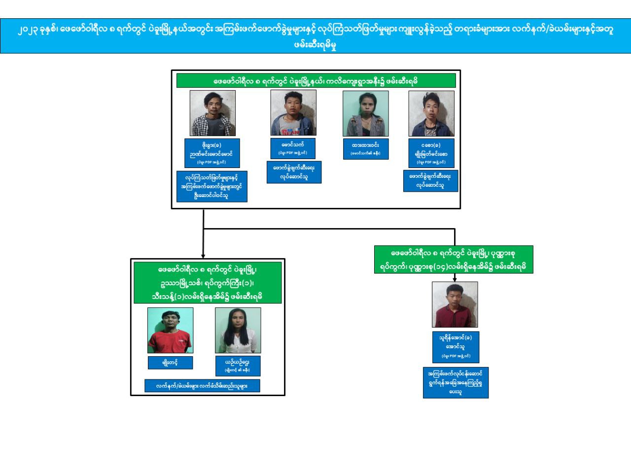 ရန်ကုန်တိုင်းဒေသကြီး ကမာရွတ်မြို့နယ်၊ မရမ်းကုန်းမြို့နယ်၊ လှိုင်မြို့နယ်နှင့် အင်းစိန်မြို့နယ်တို့ရှိ အပြစ်မဲ့ပြည်သူများအား ရက်စက်စွာ လုပ်ကြံသတ်ဖြတ်ပြီး အကြမ်းဖက်လုပ်ငန်းများ ဆောင်ရွက်လျက်ရှိသော လှိုင် PDF အမည်ခံအကြမ်းဖက်အဖွဲ့မှ တရားခံများအား ဖမ်းဆီးရမိ