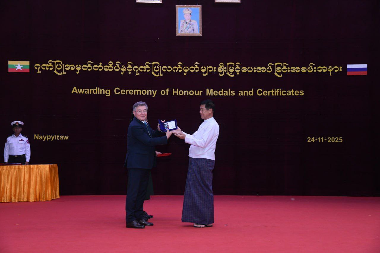ငလျင်ကယ်ဆယ်ရေးလုပ်ငန်းများ စွမ်းစွမ်းတမံဆောင်ရွက်ခဲ့ကြသည့် မြန်မာနိုင်ငံ၊ ကာကွယ်ရေးဝန်ကြီးဌာနမှကိုယ် စားလှယ်များအား ရုရှားနိုင်ငံ EMERCOM ဝန်ကြီးဌာန ဂုဏ်ပြုအမှတ်တံဆိပ်နှင့်ဂုဏ်ပြုလက်မှတ်များပေးအပ်