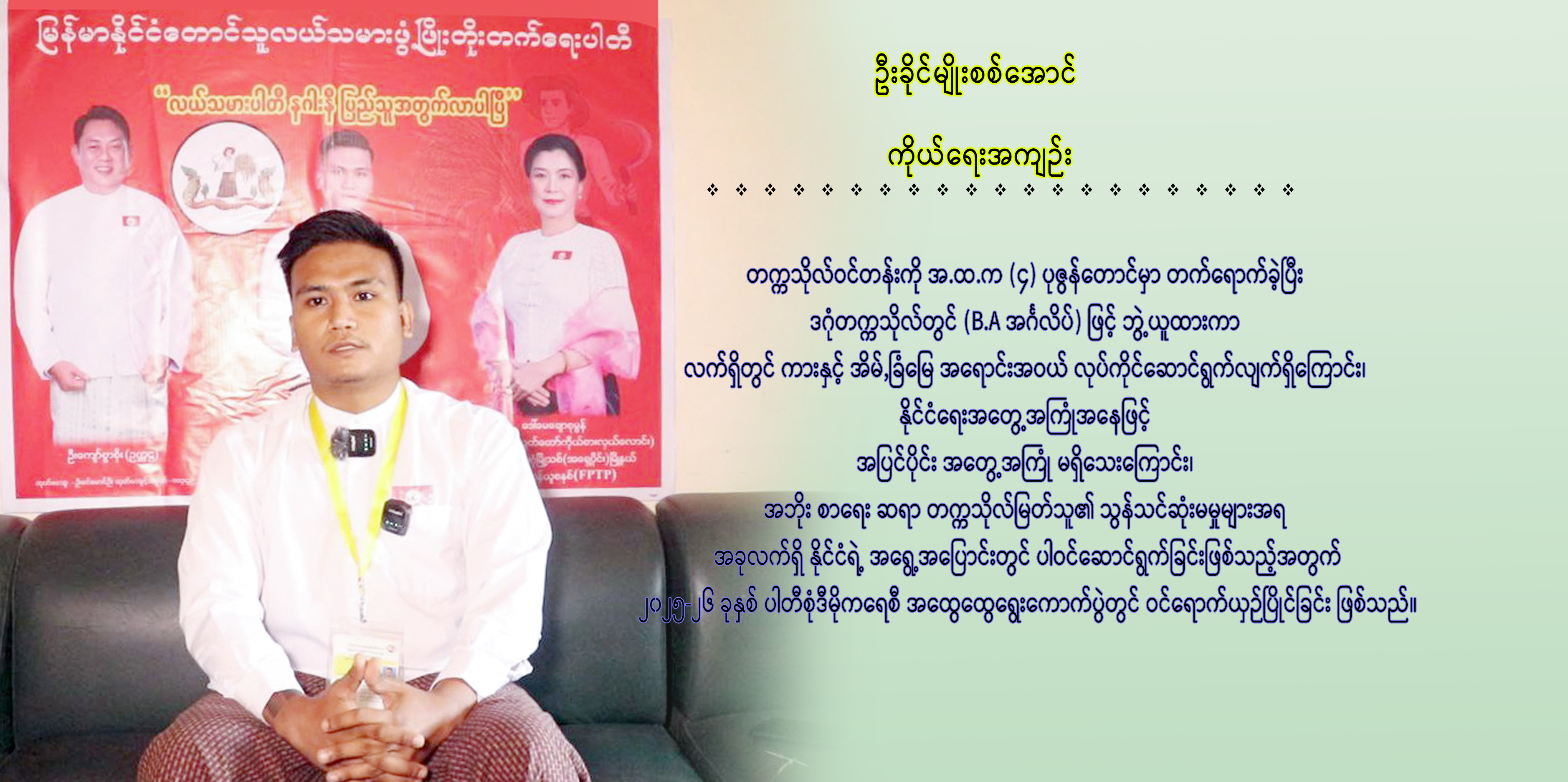 UKMSA ။ ။ ကျွန်တော့်အနေနဲ့ ၂၀၂၅ အထွေထွေရွေးကောက်ပွဲမှာ ဝင်ရောက်ယှဉ်ပြိုင်ဖြစ်တာက လွတ်လပ်ပြီး တရားမျှတမယ်။ ဒီမိုကရေစီနည်းလမ်း ကျကျသွားမယ်လို့လည်း ကျွန်တော်မျှော်လင့်တယ်။ အဲ့ဒါကြောင့်မို့ ဝင်ရောက်ယှဉ်ပြိုင် အရွေးချယ်ခံဖြစ်တာပါ။ ၂၀၂၅ ခုနှစ် ပါတီစုံဒီမိုကရေစီအထွေထွေ ရွေးကောက်ပွဲမှာ ကျွန်တော်ကတော့ ဒဂုံမြို့သစ်(အရှေ့ပိုင်း) ပြည်သူ့လွှတ်တော်နေရာကနေ ဝင်ရောက်ယှဉ်ပြိုင်တာ ဖြစ်ပါတယ်။