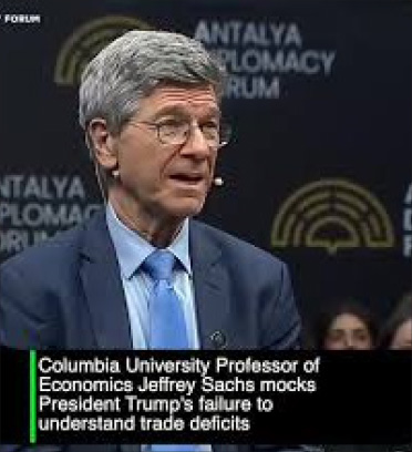 Sachs ဖြေ ။ ဒီလိုပြောရတာဟာ ကာတွန်းထဲက အမှားလုပ်တာနဲ့ တူလို့ပါ။ လိုရင်းပြောရရင် ကုန်သွယ်မှုလိုငွေဆိုတာ ကိုယ်ရောင်းလို့ ရတာ၊ ဝင်ငွေထက် ပိုသုံးလို့ဖြစ်တာ Comprehensive Trade Deficit လို့ ခေါ်ပါတယ်။ Current Account Deficit လို့လည်း ခေါ်ပါတယ်။ ကျွန်တော်တို့ အစိုးရက Credit Card လို ပြည်သူတွေအတွက် နှစ် ၂၀ လောက် လုပ်ပေးနေတယ်။ နိုင်ငံခြားဖြစ်ပစ္စည်းတွေ ဝယ်သုံးနေတော့ ကုန်သွယ်မှု၊ ဝင်ငွေထွက်ငွေ မမျှဘဲ အကြွေးတွေတင်တယ်။ ဒါကိုကုစားချင်ရင် ကုန်သွယ်မှု အလိုဖြစ်နေတာကို အရင်ကုစား၊ ကုန်သွယ်မှု အလိုမပြရင် ဘတ်ဂျက်လိုငွေလည်း လျော့သွားလိမ့်မယ်။ ထရမ့်က ဒီလိုငွေတွေကို လျှော့ချချင်ပေမယ့် သူက အခွန်ကောက်ခံတာမှာလည်း သူနဲ့အဆင် ပြေသူတွေကို အခွန်လျှော့ကောက်၊ ကာကွယ်ရေး အသုံးစရိတ်တွေကိုလည်း တိုးသုံးတော့ ဒီလိုငွေပြမှုဟာ လျော့မသွားပါဘူး။