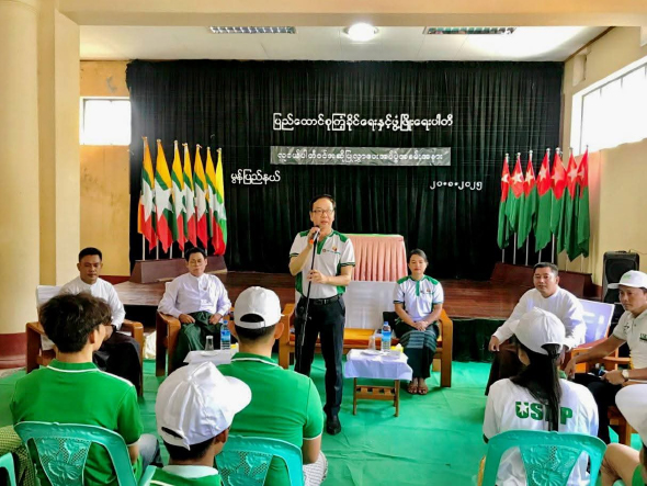 "မြို့နယ် ၃၃၀ ရှိရင် ရုံးပေါင်း ၃၃၀ ဖွင့်ထားတဲ့ပါတီပါ။ အပြည့်ပေါ့။ မြို့နယ်အရေအတွက်နဲ့ မြို့နယ်ပါတီရုံး အကုန်လုံး အပြည့်ရှိပါတယ်။ သို့သော်လည်းပဲ ဥပမာ နောင်ချိုဆိုရင် တိုင်းရင်းသားလက် နက်ကိုင်အဖွဲ့တွေ ဆုတ်ခွာသွားတဲ့အချိန်မှာ မီးရှို့ဖျက်ဆီးခံလိုက်ရတယ်။ နှစ်ထပ်ရုံးပေါ့။ အဲဒါကို ပါတီဥက္ကဋ္ဌကြီးနဲ့အဖွဲ့ အဲဒီကို သွားကြည့်တယ်။ သွားကြည့်ပြီး အဲဒီရုံးကို ပြန်လည်တည်ဆောက်မယ့် ကိစ္စတွေကို ကြည့်တယ်။ လတ်တလော ယာယီရုံးခန်းဖွင့်လှစ်ဖို့ ဆောင်ရွက်တယ်။ ပြောချင်တာကတော့ ရုံးဖွင့်လှစ်လို့ရတဲ့ နေရာမှန်သမျှ ရုံးဖွင့်ပြီးတော့ ဆောင်ရွက်ထားနိုင်တဲ့ အနေအထားတွေ ဖြစ်ပါတယ်"ဟု ၎င်းက ဆက်ပြောသည်။