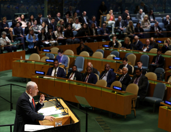 ဂါဇာစစ်ပွဲကိစ္စကြောင့် အများအာရုံစိုက်တာခံနေရတဲ့ အစ္စရေးဝန်ကြီးချုပ် ဘင်ယာမင် နေတန်ယာဟုရဲ့ မိန့်ခွန်းကလည်း အတော်လေး ကသောင်းကနင်းကိစ္စတွေ ကြုံခဲ့ပါတယ်။ နေတန်ယာဟုက ခန်းမစင်မြင့်ပေါ်မှာ နေရာယူလိုက်တဲ့ အချိန်မှာပဲ သူ့ကို ဆန့်ကျင်ဆန္ဒပြတဲ့အနေနဲ့ နိုင်ငံအများအပြားရဲ့ သံတမန်တွေက ထွက်ခွာသွားကြပါတယ်။ ကျန်နေခဲ့တဲ့ထဲက တချို့ကလည်း အဲဒီလို ခန်းမထဲက ထွက်ခွာသွားသူတွေကို လက်ခုပ်တီး သြဘာပေးခဲ့ကြပါတယ်။ ဒါဟာ ဂါဇာမှာပါ လက်စတိုင်းပြည်သူတွေကို အစ္စရေးစစ်တပ်က အကြမ်းဖက်တိုက်ခိုက် သတ်ဖြတ်နေတယ်ဆိုတဲ့ စွပ်စွဲချက်တွေကို အကြောင်းပြုပြီး အစ္စရေးအစိုးရကို ဆန္ဒပြကြတဲ့ လုပ်ရပ်တစ်ခုပါ။ ဒါပေမဲ့ နေတန်ယာဟုကလည်း တကယ့်ကို အရေထူတဲ့ ပုဂ္ဂိုလ်ပါပဲ။ သူက ပြောစရာရှိတဲ့ မိန့်ခွန်းကို ခပ်တည်တည်ပဲ ပြောသွားပါတယ်။ ပါလက်စတိုင်းကို အချုပ်အခြာအာဏာပိုင် နိုင်ငံတစ်ခုအဖြစ် သတ်မှတ်တဲ့ အစိုးရတိုင်းကို သူက ဝေဖန်သွားပါတယ်။ ပြီးတော့ ဂါဇာက စစ်ဆင်ရေးတွေနဲ့ ပတ်သက်ပြီး အစ္စရေးဟာ လုပ်စရာရှိတာကို မြန်မြန်အောင်မြင်အောင် ဆက်လုပ်သွားမယ်လို့ သူ့ရပ်တည်ချက်ကို အသိပေးသွားပါတယ်။ နေတန်ယာဟုရဲ့ စကားက ပါလက်စတိုင်း ကို နိုင်ငံအဖြစ် သတ်မှတ်တော့မယ်လို့ အခုနှစ် ကုလသမဂ္ဂညီလာခံမှာ အသီးသီးကြေညာခဲ့ကြတဲ့ ဗြိတိန်၊ ပြင်သစ်၊ ကနေဒါ၊ သြစတြေးလျတို့လို နိုင်ငံတွေကို တိုက်ရိုက်ဦးတည်ဟန်ရှိပါတယ်။ အဲဒီနိုင်ငံတွေဟာ အစဉ်အလာအရ အစ္စရေးရဲ့ မဟာမိတ်တွေ ဖြစ်ခဲ့ပေမယ့် အခုတော့ ပါလက် စတိုင်းအရေးကို အကြောင်းပြုပြီး နေတန်ယာဟုကို ကျောခိုင်းလိုက်ကြတဲ့ သဘောပါပဲ။