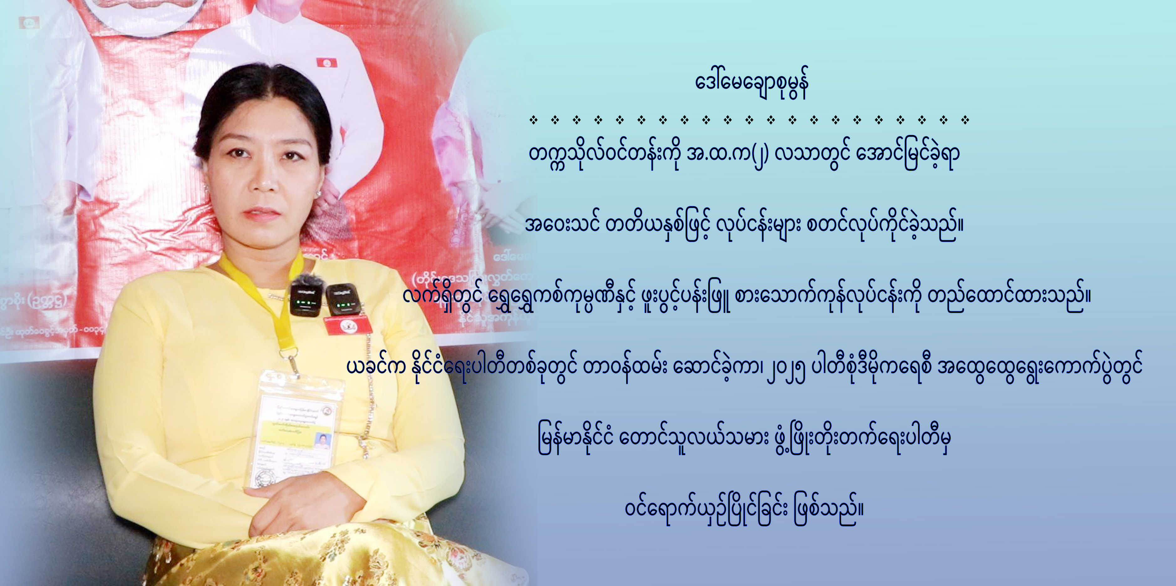 ။ မကြာမီက ပါတီစုံဒီမိုကရေစီ အထွေထွေရွေးကောက်ပွဲ အပိုင်း(၁)နဲ့ (၂)ကို ကျင်းပပြီးစီးခဲ့ပါပြီ။ အပိုင်း(၃) ကတော့ မကြာမီမှာ ကျင်းပဖို့ရှိပါတယ်။ မဲဆန္ဒရှင်ပြည်သူတွေအနေနဲ့ အပိုင်း (၃) ရွေးကောက်ပွဲမှာ ကျွန်မက မြန်မာနိုင်ငံ တောင်သူလယ်သမားဖွံ့ဖြိုးတိုးတက်ရေးပါတီ တိုင်းဒေသကြီး လွှတ်တော်ကိုယ်စားလှယ် FPTP အနေနဲ့ ဝင်ရောက်ယှဉ်ပြိုင်မှာ ဖြစ်ပါတယ်။ မဲဆန္ဒရှင် ပြည်သူတွေ အနေနဲ့ မည်သည့် ပါတီကိုမဆို မဲပေးနိုင်သလို၊ ကျွန်မတို့ ပါတီကိုမဲပေးမယ်ဆိုရင် ပါတီလိုဂိုအနေနဲ့ အနီရောင်အခံမှာ နဂါးနှစ် ကောင်ရဲ့အလယ်မှာ လူရုပ်လေးနဲ့ တံစဉ်နဲ့ စပါးနှံကိုကိုင်ထားတာရှိပါတယ်။ ကျွန်မကို လိုလားတယ်ဆိုရင်၊ လွှတ်တော်ကိုယ်စားလှယ်လောင်းဖြစ်အောင်၊ ကိုယ့်မြို့နယ်ကို ကူညီနိုင်အောင် ဆောင်ရွက်ပေးကြပါလို့ ပြည်သူတွေကို ပြောလိုပါတယ်။