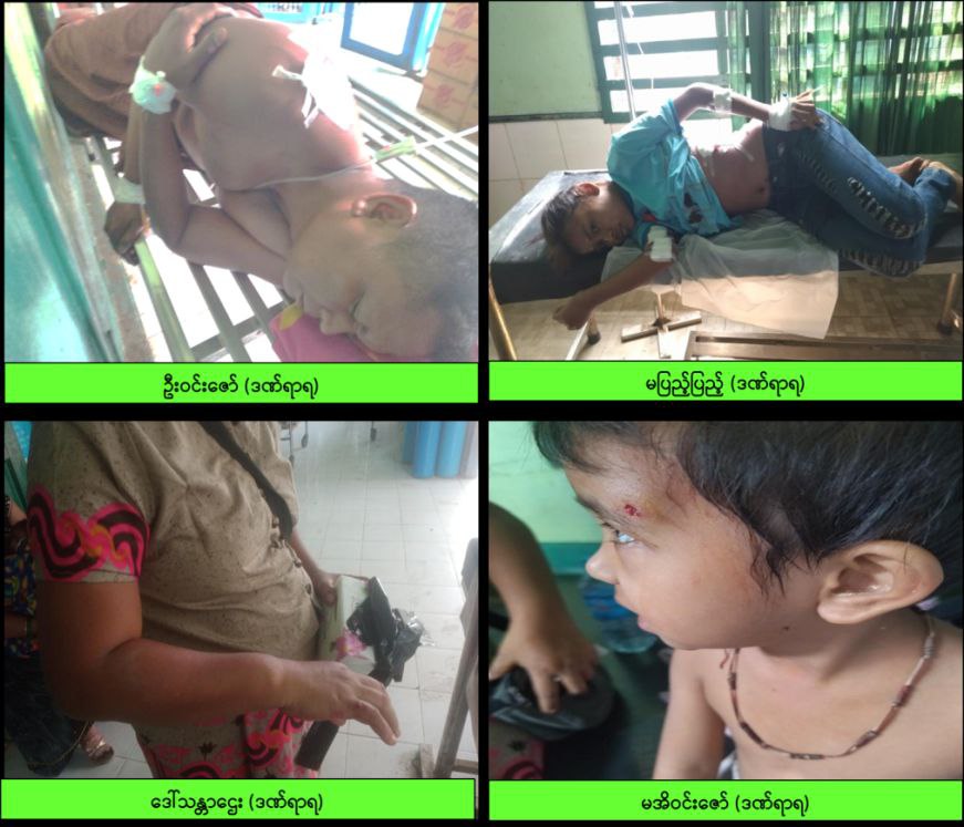 ထိုသို စစ်ဆေးခဲ့ရာ ဦးဝင်းဇော်(၄၆)နှစ်(မြို့မ(၁)ရပ်ကွက် ဇေယျဝတီမြို ဖြူးမြို့နယ်နေသူတွင် ယာတံတောင်ဗုံးစထိမှန်ဒဏ်ရာ ၁ ချက်၊ ယာပုခုံး ဗုံးစထိမှန် ဒဏ်ရာ ၂ ချက်၊ ကျောကုန်းဗုံးစထိမှန်ဒဏ်ရာ ၅ ချက်၊ ယာနံဘေးဗုံးစထိမှန်ဒဏ်ရာ ၁ ချက်၊ ယာခြေကျင်းဝတ်ဗုံးစထိမှန်ဒဏ်ရာ ၁ ချက်၊ ဦးခေါင်းဝဲဘက်ဗုံးစထိမှန်ဒဏ်ရာ ၁ ချက်၊ စုစုပေါင်း ဒဏ်ရာ ၁၁ ချက်(စိုးရိမ်ရ)၊ ဦးဝင်းဇော် ၏ဇနီးဖြစ်သူ ဒေါ်သန္တာဌေး(၃၈)နှစ်တွင် ယာလက်သန်းဗုံးစထိမှန်ဒဏ်ရာ ၁ ချက်၊ ဝဲဒူးဗုံးစထိမှန်ဒဏ်ရာ ၁ ချက်၊ စုစုပေါင်း ဒဏ်ရာ ၂ ချက် (မစိုးရိမ်ရ)၊ ဦးဝင်းဇော် ၏သမီးများဖြစ်သော မပြည့်ပြည့်(၁၃)နှစ်တွင် ယာလက်မောင်း ဗုံးစထိမှန်ဒဏ်ရာ ၁ ချက်၊ ဝဲလက်ဖျံဗုံးစထိမှန်ဒဏ်ရာ ၁ ချက်၊ ဝဲပေါင်ဗုံးစထိမှန်ဒဏ်ရာ ၁ ချက်၊ စုစုပေါင်းဒဏ်ရာ ၃ ချက်(မစိုးရိမ်ရ)နှင့် မအိဝင်းဇော်(၄)နှစ်တွင် ဝဲမျက်ခုံးပေါက်ပြဲဒဏ်ရာ ၁ ချက်(မစိုးရိမ်ရ)တို အသီးသီးရရှိသည်ကိုတွေ့ရှိခဲ့ပြီး အခင်းဖြစ်နေရာ၌ Drop Bomb ၂ လုံး၏ အမြှီးပိုင်းအား နိုင်လွန်ကြိုးအဝါရောင်ဖြင့် ချည်ထားသည့်အပိုင်းအစများအား တွေ့ရှိခဲ့ကြောင်း သိရသည်။