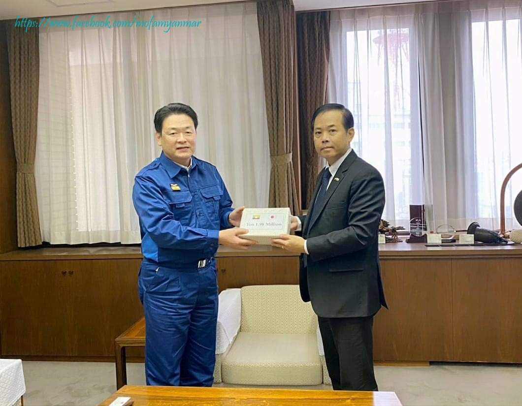 ဂျပန်နိုင်ငံ ငလျင်ဘေးဒဏ်သင့် ပြည်သူလူထုအတွက် မြန်မာသံရုံး၊ ဝန်ထမ်းများနှင့် မိသားစုဝင်များ၊ ဂျပန်နိုင်ငံရောက် မြန်မာနိုင်ငံသားများ၊ ဂျပန်နိုင်ငံတွင် ပညာ သင်ကြားနေကြသည့် နိုင်ငံ့ဝန်ထမ်း ပညာတော်သင်များနှင့် မြန်မာနိုင်ငံတွင် ရင်းနှီးမြှုပ်နှံလျက်ရှိကြသော ဂျပန်ကုမ္ပဏီများ၊ မြန်မာနိုင်ငံဆိုင်ရာ ဂုဏ်ထူးဆောင်ကောင်စစ်ဝန်များ၊ ဂျပန်နိုင်ငံတွင် လုပ်ငန်းများ ဆောင်ရွက်လျက်ရှိကြသည့် မြန်မာကုမ္ပဏီများနှင့် စေတနာရှင်များ၏ စုပေါင်းလှူဒါန်းငွေ ယန်း ၁ ဒသမ ၉၈ သန်းအား မြို့တော်ဝန် Mr.Yoshitaka Chatani ထံသို့ ပေးအပ်လှူ ဒါန်းခဲ့ကြောင်း သိရသည်။