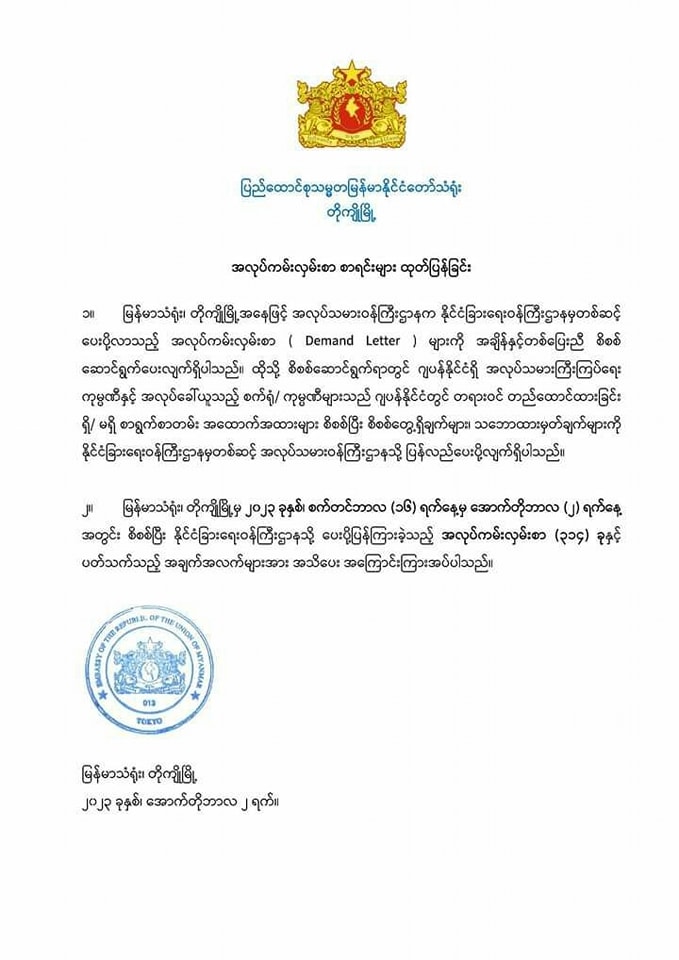 အလုပ်သမားဝန်ကြီးဌာနက နိုင်ငံခြားရေးဝန်ကြီးဌာနမှတစ်ဆင့် ဂျပန်နိုင်ငံ တိုကျိမြို့ရှိ မြန်မာသံရုံးထံသို့ ပေးပို့လာသည့် အလုပ်ကမ်းလှမ်းစာ (Demand Letter) များကို အချိန်နှင့် တစ်ပြေးညီ စိစစ် ဆောင်ရွက်ပေးခဲ့ကြောင်း ထုတ်ပြန်ချက်တွင် ပါရှိသည်။