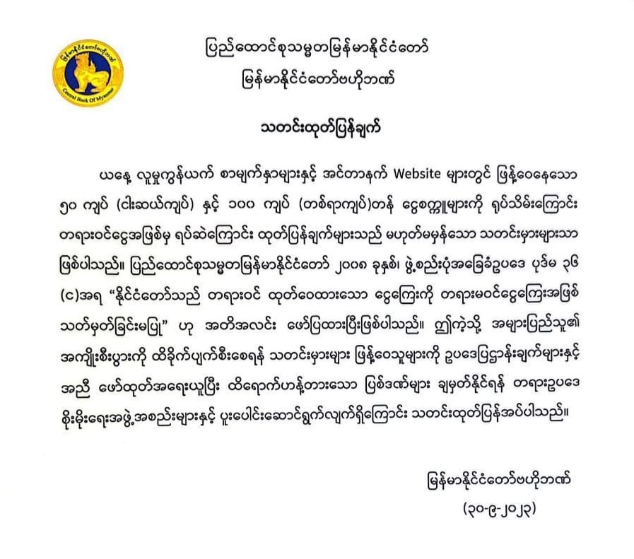 ၅၀ တန်၊ ၁၀၀ တန်ငွေစက္ကူများအား ရုတ်သိမ်းမည်ဟု စက်တင်ဘာ ၂၉ ရက် ရက်စွဲဖြင့် ဗဟိုဘဏ်မှထုတ်ပြန်သည်ဟု ထုတ်ပြန်ချက်အတုတစ်စောင် လူမှုကွန်ယက်စာမျက်နှာများပေါ်၌ ထွက်ပေါ်ခဲ့ခြင်းနှင့်ပတ်သက်၍ ဗဟိုဘဏ်မှပြန်လည်ရှင်းလင်းထုတ်ပြန်ခဲ့ခြင်းဖြစ် သည်။