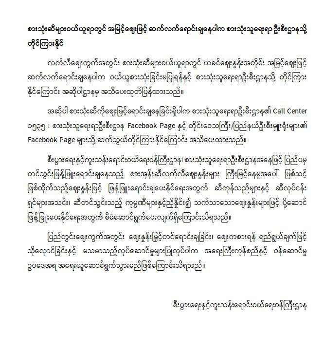 အဆိုပါ စားသုံးဆီကိုဈေးမြင့်ရောင်းချနေခြင်းရှိပါက စားသုံးသူရေးရာဦးစီးဌာန၏ Call Center၁၅၃၅ ၊ စားသုံးသူရေးရာဦးစီးဌာန Facebook Page နှင့် တိုင်းဒေသကြီး/ပြည်နယ်ဦးစီးမှူးရုံးများ၏ Facebook Page များသို ဆက်သွယ်တိုင်ကြားနိုင်ကြောင်း အသိပေးထားခြင်း ဖြစ်သည်။