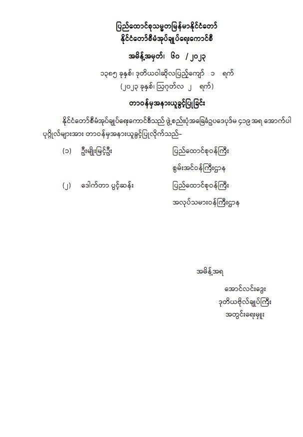 စွမ်းအင်၀န်ကြီးဌာန ပြည်ထောင်စု၀န်ကြီး ဦးမျိုးမြင့်ဦးနှင့် အလုပ်သမား၀န်ကြီးဌာနပြည်ထောင်စုဝန်ကြီး ဒေါက်တာ ပွင့်ဆန်းတို့အား တာဝန်မှအနားယူခွင့်ပြုလိုက်ကြောင်း နိုင်ငံတော်စီမံအုပ်ချုပ်ရေးကောင်စီက အမိန့်အမှတ်၊ ၆၀ / ၂၀၂၃ ဖြင့် ယနေ့ (ဩဂုတ်လ ၂ ရက်) ထုတ်ပြန်ကြေညာခဲ့သည်။