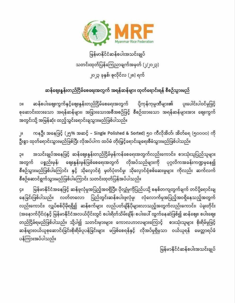 လတ်တလောတွင်း ပြည်တွင်း၌ ဆန်ပြတ်လပ်မှုများ ဖြစ်ပေါ်နေကြောင်း သတင်းများ ဖြန့်ဝေမှုများ ရှိနေပြီး အဆိုပါ ကောလာဟလများကြောင့် စားသုံးသူများ စိုးရိမ်မှုဖြင့် ဆန်များကို ဝယ်ယူစုဆောင်းခြင်းများ မလုပ်ဆောင်ဘဲ လိုအပ်မှုရှိမှသာ ဝယ်ယူကြရန် အသင်းချုပ်က မေတ္တာရပ်ခံ အသိပေးထားသည်။
