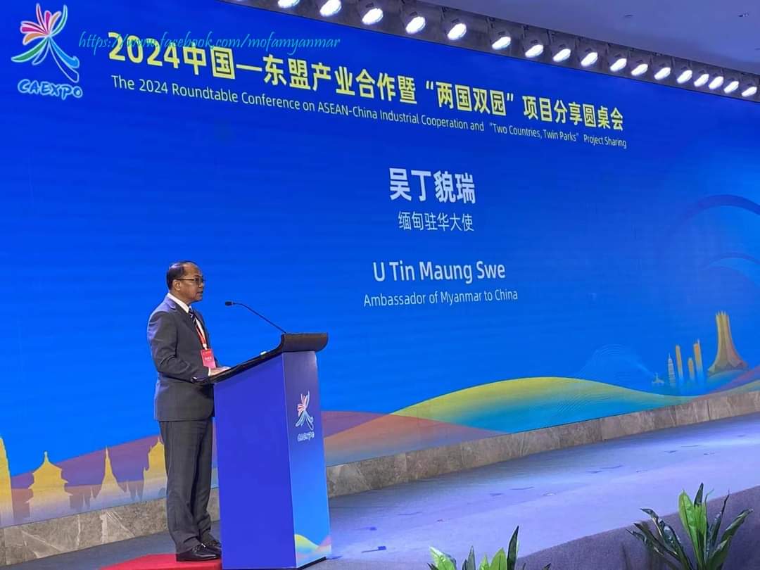 တရုတ်ပြည်သူ့သမ္မတနိုင်ငံ ကွမ်းရှီးကျွမ့် ကိုယ်ပိုင်အုပ်ချုပ်ခွင့်ရဒေသ၊ နန်နင်းမြို့တွင် ကျင်းပသည့် (၂၁) ကြိမ်မြောက် အာဆီယံ-တရုတ် ကုန်စည်ပြပွဲ၏ ဆက်စပ် အစည်းအဝေးတစ်ခုအဖြစ်၂၀၂၄ ခုနှစ် ဒုတိယအကြိမ်မြောက် China-ASEAN Industrial Cooperation and “Two Countries and Twin Parks” စီမံကိန်းဆိုင်ရာ စကားဝိုင်းဆွေးနွေးပွဲသို့ တရုတ်ပြည်သူ့သမ္မတနိုင်ငံဆိုင်ရာ မြန်မာသံအမတ်ကြီး ဦးတင်မောင် ဆွေ တက်ရောက်မိန့်ခွန်းပြောကြားရာတွင် အထက်အတိုင်း ထည့်သွင်းပြောကြားခဲ့ခြင်း ဖြစ်သည်။