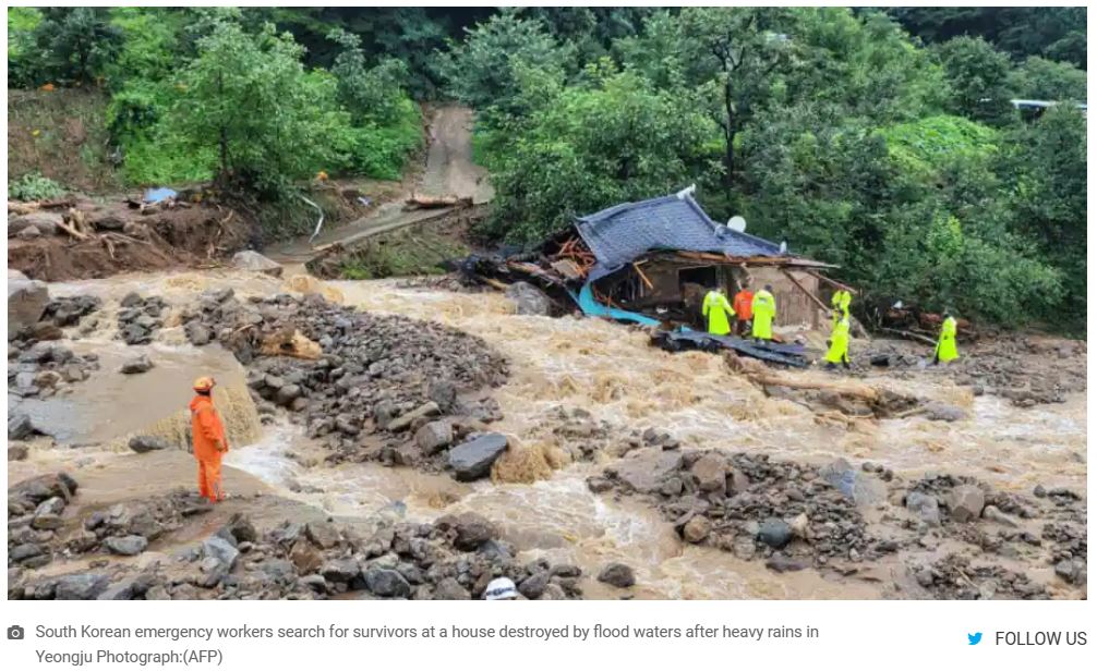 တောင်ကိုရီးယားနိုင်ငံ၌ မုတ်သုန်မိုးသည်းထန်စွာရွာသွန်းပြီး ရေကြီးမြေပြိုမှုများကြောင့်သေဆုံးသူ ၂၄ ဦးအထိရှိလာပြီဖြစ်ကြောင်းသိရသည်။ဒါဇင်နှင့်ချီသောသူများလည်းပျောက်ဆုံးနေပြီး လူပေါင်းထောင်ချီကာဘေးလွတ်ရာသို့ရွှေ့ပြောင်းနေကြရသည်ဟုလည်းဆိုသည်။