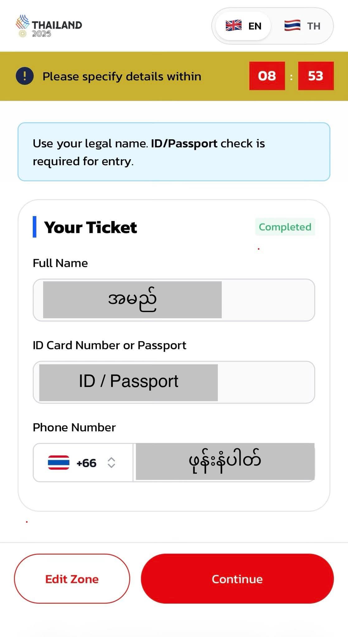 အဆင့်(၄) မိမိ အမည်၊ ID/Passport ဖြည့်သွင်း၍ Confirmed ပြုလုပ်ပြီးပါက QR ကျလာပါလိမ့်မည်။