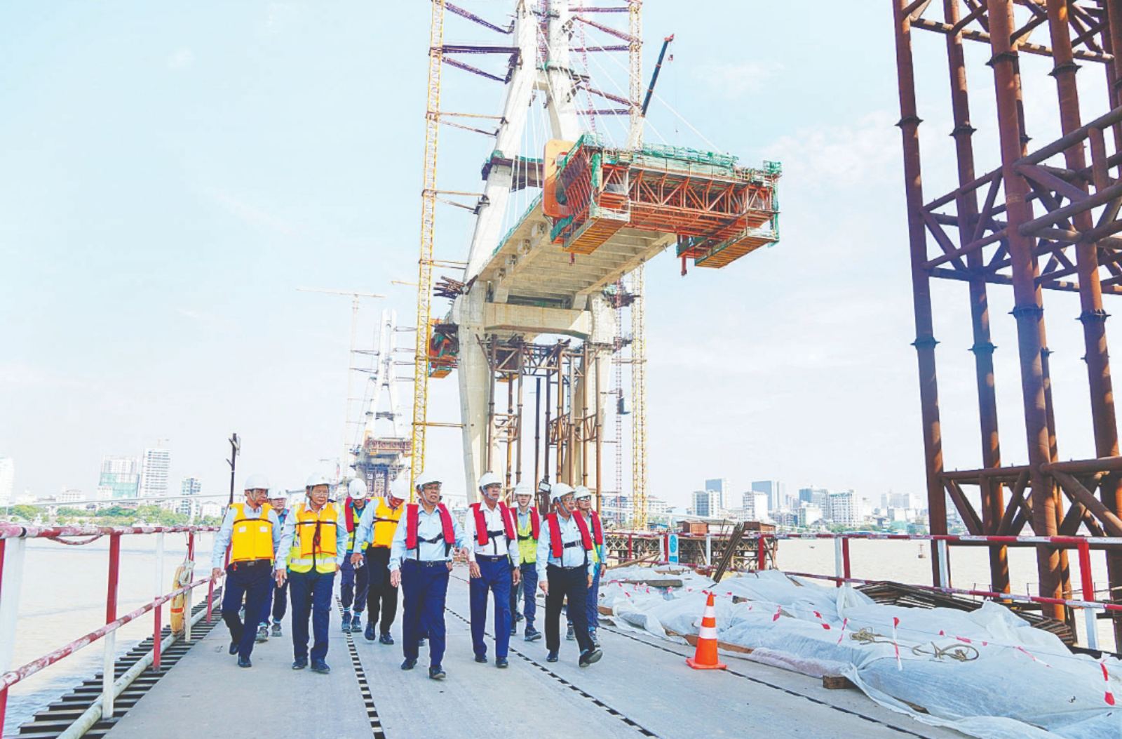 ပြည်ထောင်စုဝန်ကြီးနှင့် အဖွဲ့သည် ရန်ကုန်ဘက်ခြမ်း ကမ်းနားလမ်း ဆင်ခြေလျှော တံတားနှစ်စင်း ဆောင်ရွက်ပြီးစီးမှုနှင့် ဘုန်းကြီးလမ်းတစ်လျှောက် ချဉ်းကပ်တံတား လုပ်ငန်း ဆောင်ရွက်ပြီးစီးမှု အခြေအနေ၊ ဒလဘက်ခြမ်းရှိ ပင်မတံတားရေလယ်တာဝါတိုင် (Pylon-1) သို့ ရေယာဉ်ဖြင့်သွားရောက်၍ လုပ်ငန်းဆောင်ရွက်နေမှု အခြေအနေတို့ကို အသေးစိတ် လိုက်လံကြည့်ရှုစစ်ဆေးခဲ့ပြီး လုပ်ငန်းများအားလုံး သတ်မှတ် ချိန်အမီပြီးစီးရေး တည်ဆောက်သွားရန်တို့ကို မှာ ကြားခဲ့ကြောင်း သိရသည်။