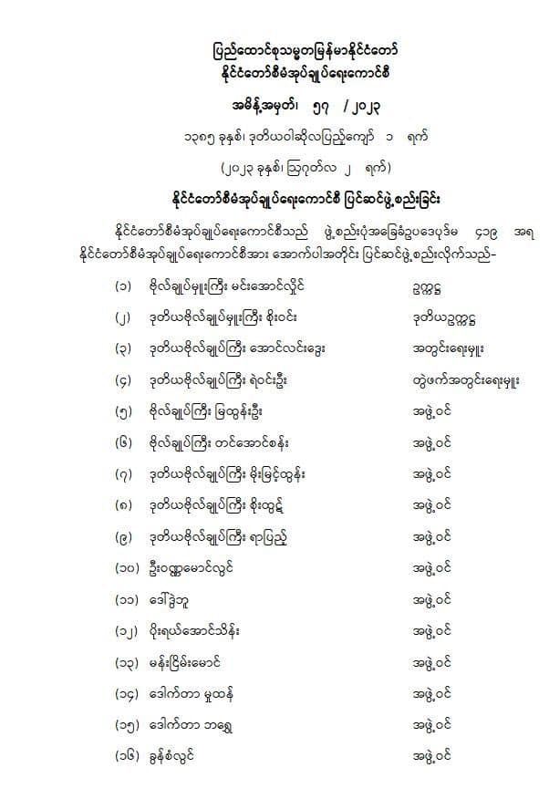 နိုင်ငံတော်စီမံအုပ်ချုပ်ရေးကောင်စီကို ပြင်ဆင်ဖွဲ့စည်းကြောင်း နိုင်ငံတော်စီမံအုပ်ချုပ်ရေးကောင်စီက အမိန့်အမှတ်၊ ၅၇ / ၂၀၂၃ ဖြင့် ယနေ့ (ဩ ဂုတ်လ ၂ ရက်)ထုတ်ပြန်လိုက်သည်။