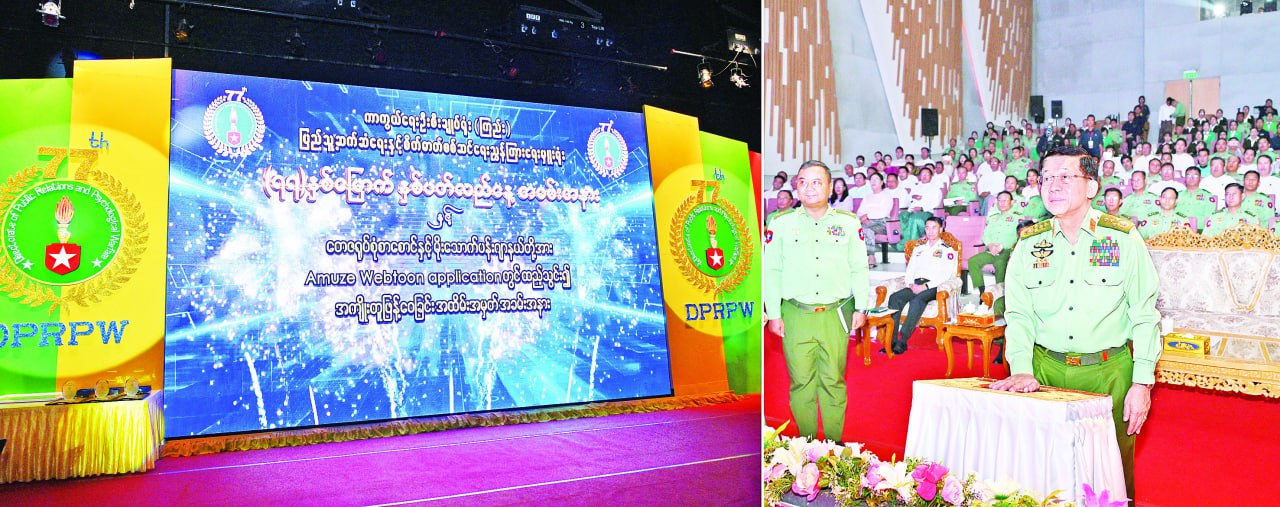 ကာကွယ်ရေးဦးစီးချုပ်ရုံး(ကြည်း)၊ ပြည်သူ့ဆက်ဆံရေးနှင့် စိတ်ဓာတ်စစ်ဆင်ရေး ညွှန်ကြားရေးမှူးရုံး (၇၇) နှစ်မြောက် နှစ်ပတ်လည်နေ့အခမ်းအနားကို ယနေ့မွန်းလွဲပိုင်းတွင် နေပြည်တော်ကောင်စီနယ်မြေ ဥတ္တရသီရိမြို့နယ် တောင်ညိုမြို့ရှိ အမှတ် (၂) တပ်မတော်ရုပ်မြင်သံကြား ထုတ်လွှင့်ရေးတပ်၌ ကျင်းပပြုလုပ်ရာ နိုင်ငံတော်စီမံအုပ်ချုပ်ရေးကောင်စီဥက္ကဋ္ဌ တပ်မတော်ကာကွယ်ရေးဦးစီးချုပ် ဗိုလ်ချုပ်မှူးကြီး မင်းအောင်လှိုင် တက်ရောက်ချီးမြှင့်ပြီး ဂုဏ်ပြုအမှာစကား ပြောကြားသည်။