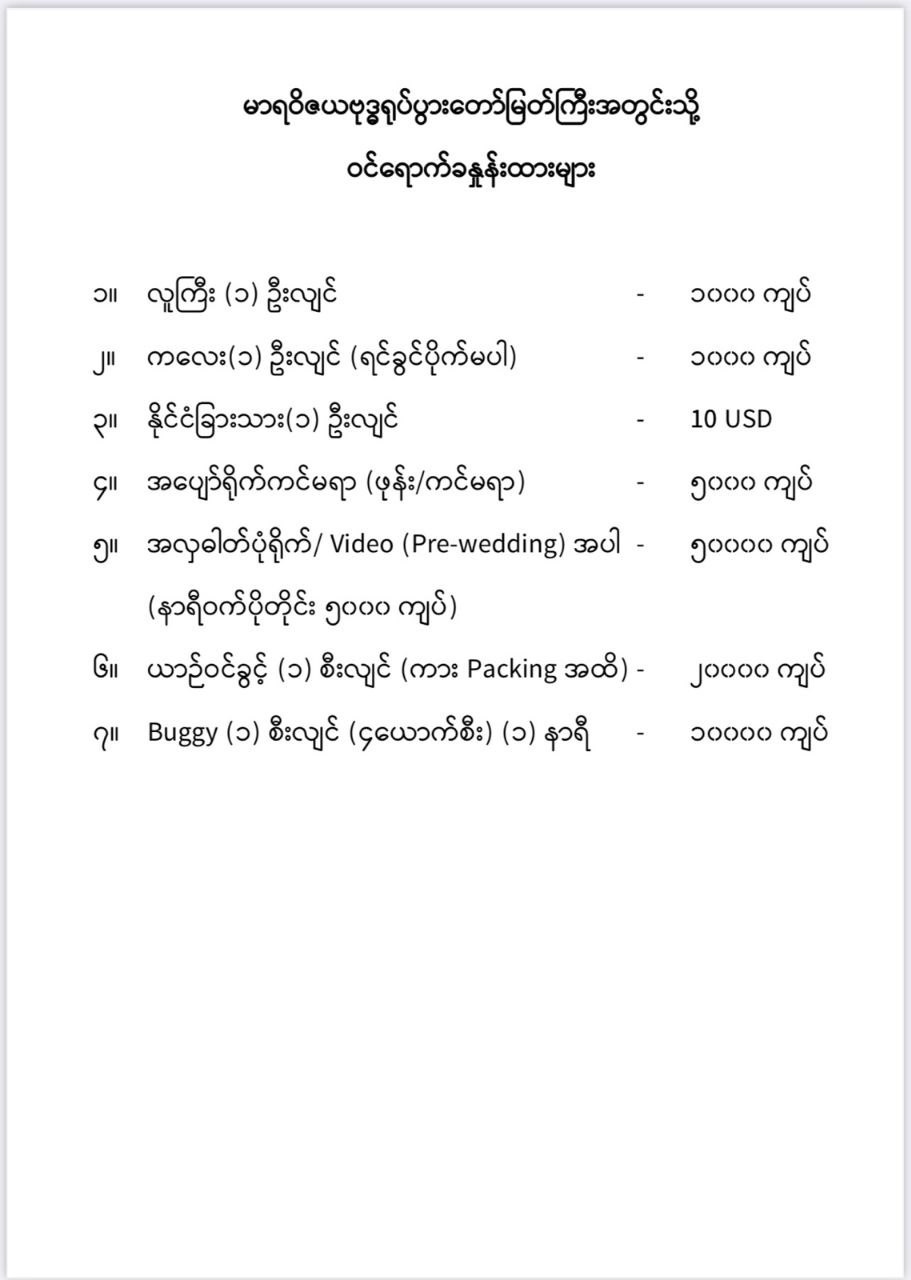 ဩဂုတ် ၁၇ ရက်နေ့ကစပြီးတော့ လူကြီး တစ်ဦး ကျပ် ၁၀၀၀၊ ကလေး တစ်ဦး (ရင်ခွင်ပိုက်မပါ) ကျပ် ၁၀၀၀၊ နိုင်ငံခြားတစ်ဦးကို အမေရိကန် ဒေါ်လာ ၁၀ ဒေါ်လာ၊ အပျော်ရိုက် ကင်မရာ (ဖုန်း/ ကင်မရာ) ကျပ် ၅၀၀၀၊ အလှဓာတ်ပုံရိုက် / Video (Pre Wedding) အပါ ကျပ် ၅၀၀၀၀ သတ်မှတ်ထားပြီး နာရီဝက်ကျော်ပါက ကျပ် ၅၀၀၀ ထပ်ပေးရပါမယ်။