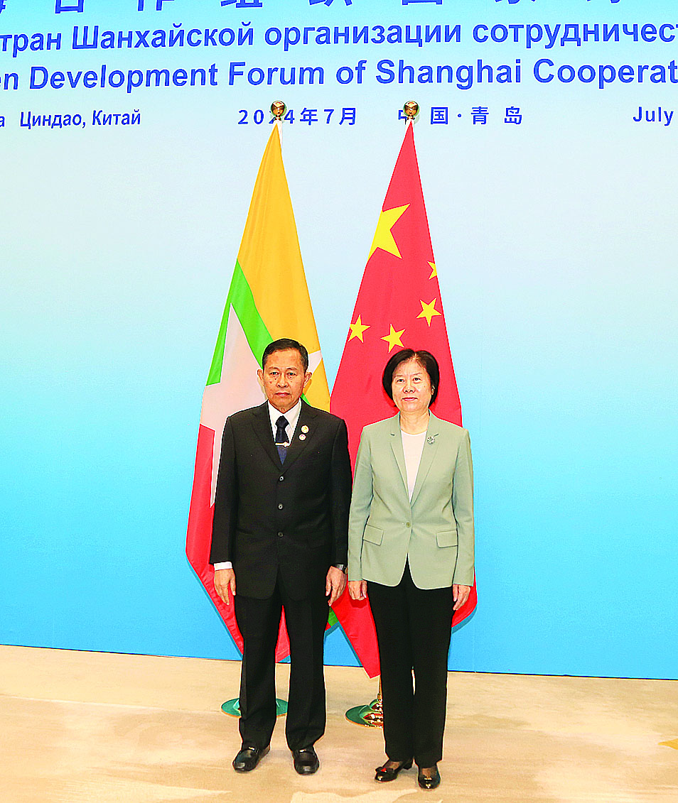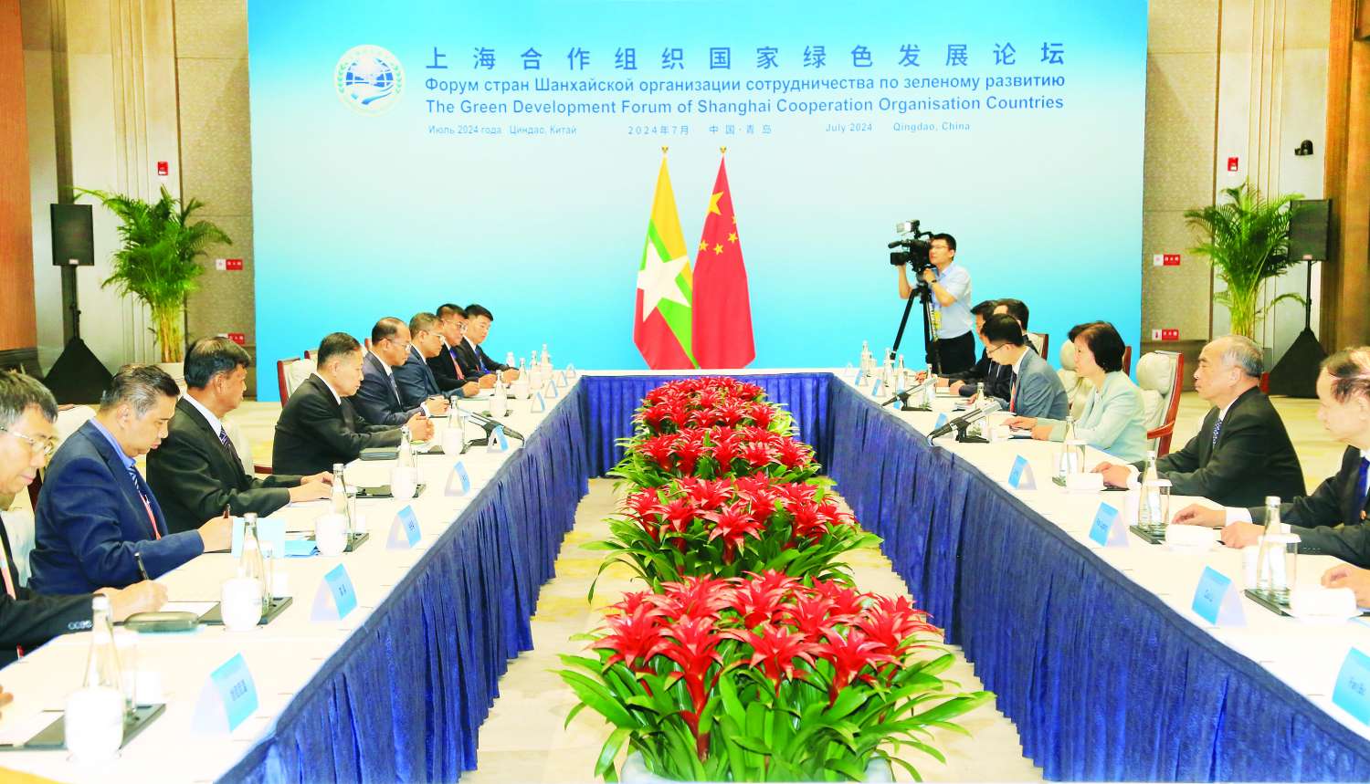 ရှန်ဟိုင်းပူးပေါင်းဆောင်ရွက်ရေးအဖွဲ့ (SCO) ၏ စိမ်းလန်းသော ဖွံ့ဖြိုးမှုဖိုရမ်သို့ တက်ရောက်ရန် ချင်းတောင်မြို့၌ ရောက်ရှိနေသည့် နိုင်ငံတော်စီမံအုပ်ချုပ်ရေးကောင်စီ ဒုတိယဥက္ကဋ္ဌ ဒုတိယဝန်ကြီးချုပ် ဒုတိယဗိုလ်ချုပ်မှူးကြီးစိုးဝင်းသည် Qing-dao International Conference Center ရှိ Anren ခန်းမ၌ ကျင်းပသည့် မြန်မာ-တရုတ် နှစ်နိုင်ငံ တွေ့ဆုံဆွေးနွေးပွဲ အခမ်းအနားသို့ တက်ရောက်ခဲ့သည်။