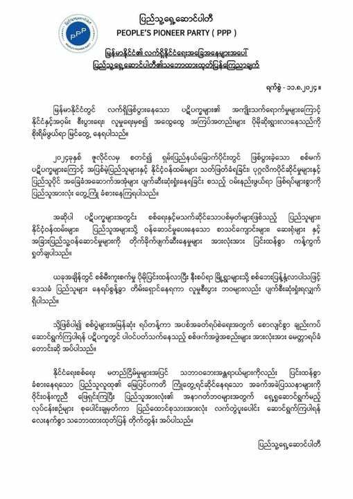 ပဋိပက္ခများအတွင်း နိုင်ငံနှင့်တစ်ဝန်း စီးပွားရေး၊ လူမှုရေးမှစ၍ အထွေထွေအကြပ်အတည်းများ ပိုမိုဆိုးရွားလာနေသည်ကို တွေ့မြင်နေရကြောင်းနှင့် စစ်ပွဲများအတွင်း စစ်မက်နှင့်မသက်ဆိုင်သော ပစ်မှတ်များအား အကြမ်းဖက်တိုက်ခိုက် သတ်ဖြတ်မှုကို ရှုတ်ချကြောင်း မြန်မာနိုင်ငံ၏ လက်ရှိ နိုင်ငံရေး အခြေအနေများအပေါ် ပြည်သူ့ရှေ့ဆောင်ပါတီသဘောထား ထုတ်ပြန်ကြေညာချက် ထုတ်ပြန်လိုက်သည်။