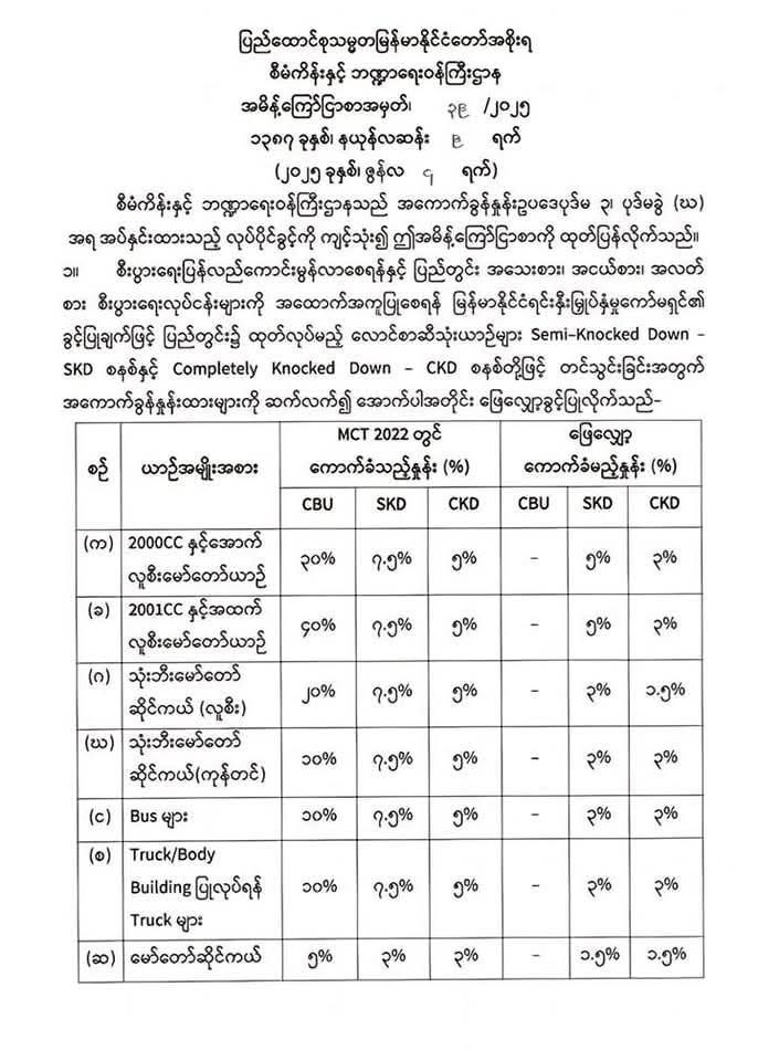 ပြည်တွင်း၌ ထုတ်လုပ်မည့် လောင်စာဆီသုံး ယာဉ်များ SKD နှင့် CKD စနစ်ဖြင့် တင်သွင်းခြင်းအတွက် အကောက်ခွန်နှုန်းထားများ ဆက်လက်ဖြေလျှော့ခွင့်ပြုလိုက်ကြောင်း စီမံကိန်းနှင့်ဘဏ္ဍာရေးဝန်ကြီးဌာနမှ ထုတ်ပြန်ခဲ့သည်။
