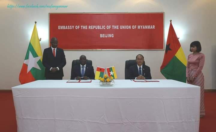ပြည်ထောင်စုသမ္မတမြန်မာနိုင်ငံတော်နှင့် ဂီနီဘစ်ဆောသမ္မတနိုင်ငံတို့အကြား သံတမန် အဆက်အသွယ်ထူထောင်ခြင်းဆိုင်ရာ ပူးတွဲကြေညာချက်ကို တရုတ်ပြည်သူ့သမ္မတနိုင်ငံဆိုင်ရာ မြန်မာသံအမတ်ကြီး ဦးတင်မောင်ဆွေနှင့် တရုတ်ပြည်သူ့သမ္မတနိုင်ငံဆိုင်ရာ ဂီနီဘစ်ဆော သံအမတ်ကြီး H.E. Mr. António Serifo Embaló တိုက ၂၀၂၃ ခုနှစ်၊ မတ်လ ၆ ရက်တွင် ပေကျင်းမြို၊ မြန်မာသံရုံး၌ လက်မှတ်ရေးထိုးခဲ့ကြသည်။