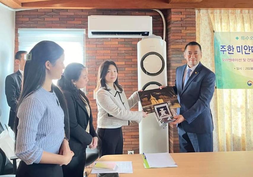 ကိုရီးယားသမ္မတနိုင်ငံ ဘူဆန်မြို့ရှိ ဘူဆန်နိုင်ငံခြားဘာသာတက္ကသိုလ် (Busan University of Foreign Studies) မှ မြန်မာစာ အထူးပြုဘွဲ့ကြိုသင်တန်း တက်ရောက်နေကြသည့် တက္ကသိုလ်ကျောင်းသား ကျောင်းသူ ၁၂ ဦး၊ ပါမောက္ခ Dr. JiHye KIM နှင့် အတွင်းရေးမှူးတစ်ဦးတို့သည် ၂၀၂၄ ခုနှစ် နိုဝင်ဘာ ၄ ရက်က မြန်မာသံရုံး ဆိုးလ်မြို့သို့ လေ့လာရေးခရီးစဉ် လာရောက်ခဲ့ကြကြောင်း သံရုံး၏ ထုတ်ပြန်ချက်အရ သိရသည်။