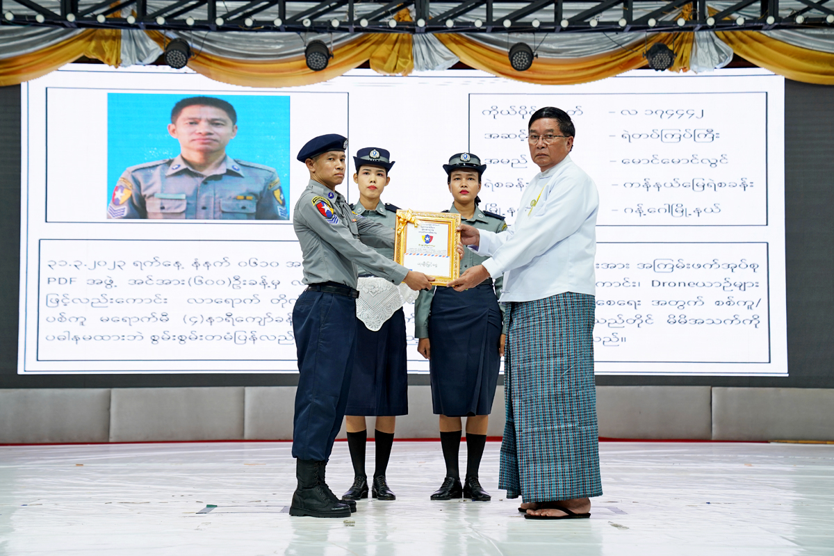 အဆိုပါအခမ်းအနားတွင် မကွေး တိုင်းဒေသကြီးရဲတပ်ဖွဲ့နယ်မြေအတွင်း အကြမ်းဖက်အုပ်စု ဏီၤ အဖွဲ့များနှင့် စွမ်း စွမ်းတမံ တိုက်ပွဲဝင်စဉ်က ဒဏ်ရာရ၊ ကျဆုံး ခဲ့သည့် ရဲတပ်ဖွဲ့ဝင်များအား တိုင်းဒေသကြီး ဝန်ကြီးချုပ် ဦးတင့်လွင်၊ တပ်မတော် အရာရှိ ကြီးများ၊ တရားသူကြီးချုပ် ဦးမြင့်သိန်း၊ လုံ ခြုံရေးနှင့် နယ်စပ်ရေးရာဝန်ကြီး ဗိုလ်မှူးကြီး ကျော်ကျော်လင်းနှင့် တိုင်းဒေသကြီးရဲတပ်ဖွဲ့မှူး ရဲမှူးကြီး လင်းထွဋ်တို့က ဂုဏ်ထူးဆောင် တံဆိပ်များနှင့် ဂုဏ်ပြုဆုငွေများ ချီးမြှင့်ပေးအပ်ခဲ့သည်။