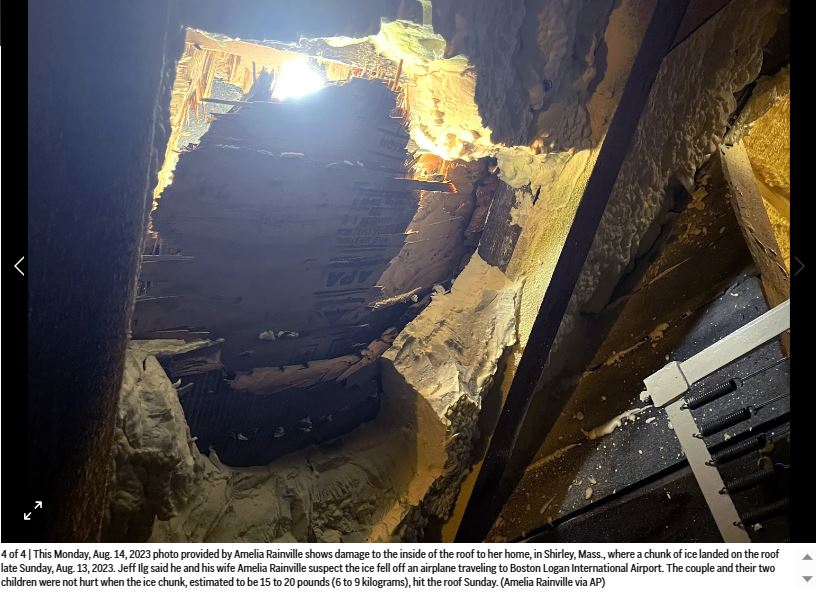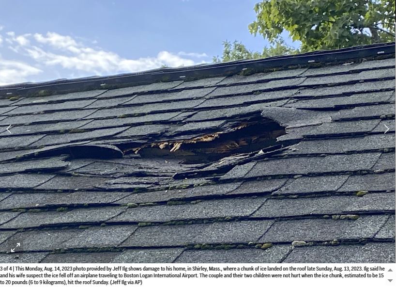 ၎င်းရေခဲတုံးသည် ဘော်စတွန်လော်ဂန်လေဆိပ်သို့သွားသည့်လေယာဉ်ပေါ်မှ ပြုတ်ကျခြင်းဖြစ်နိုင်ကြောင်း အဆိုပါအိမ်ပိုင်ရှင်ဇနီးမောင်နှံကပြောကြားခဲ့သည်။