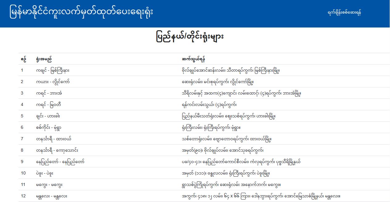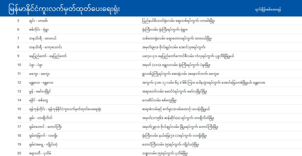 ထို့အပြင် မြစ်ကြီးနား၊ မုံရွာ၊ လားရှိုး၊ တောင်ကြီး၊ ကျိုင်းတုံ၊ စစ်တွေ၊ ဟားခါး၊ ဘားအံ၊ မော်လမြိုင်၊ ထားဝယ်၊ မကွေးတို့တွင် မေ၂ ရက်မှစ၍ Online Appointm-ent System ဖြင့် ဆောင်ရွက်သွားမည် ဖြစ်ပါကြောင်း၊ နေပြည်တော်ရှိ နိုင်ငံကူးလက်မှတ်ထုတ်ပေးရေးရုံးခွဲတွင် ရန်ကုန်တိုင်းဒေသကြီး အိမ်ထောင်စုစာရင်းနှင့် Online Booking လျှောက်ထားနိုင်ပါကြောင်း၊ ကယားပြည်နယ် အိမ်ထောင်စုစာရင်း ဝင်သူများသည် ပြည်နယ်အစိုးရအဖွဲ့ (သို့မဟုတ်)တိုင်း စစ်ဌာနချုပ် ထောက်ခံချက်ဖြင့် တောင်ကြီးရုံးခွဲကို ရွေးချယ်လျှောက်ထားနိုင်ပါကြောင်း သိရသည်။