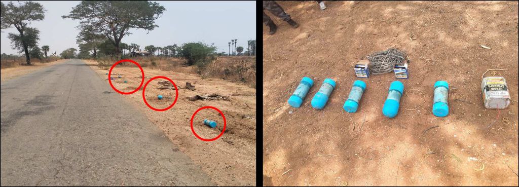 ယင်းသို စစ်ဆေးခဲ့ရာ အဆိုပါနေရာ၌ မြေမြှုပ်ကာထောင်ထားသည့် PVC ပိုက်ဖြင့်ပြု လုပ်ထားသော လက်လုပ်မိုင်း ၅ လုံး၊ သံပုံးဖြင့် ပြုလုပ်ထားသော လက်လုပ်မိုင်း ၁ လုံး၊ စုစုပေါင်းလက်လုပ်မိုင်း ၆ လုံး၊ ဆိုင်ကယ် Battery ၂ လုံး၊ကိုက် ၁၀၀ ခန့်အရှည် ဝါယာကြိုး ၁ ခွေ တိုအား စစ်ဆေးတွေ့ရှိ သိမ်းဆည်ရရှိခဲ့၍ လက်လုပ်မိုင်းများအား သက်မဲ့ပြုလုပ်ကာ လက်လုပ်မိုင်းများထောင်ထားသော နေရာ၏အရှေဘက် ကိုက် ၂၀၀ ခန့်အကွာရှိ ကွင်းပြင်တွင်ဖောက်ခွဲဖျက်ဆီးခဲ့ကြောင်း သိရသည်။