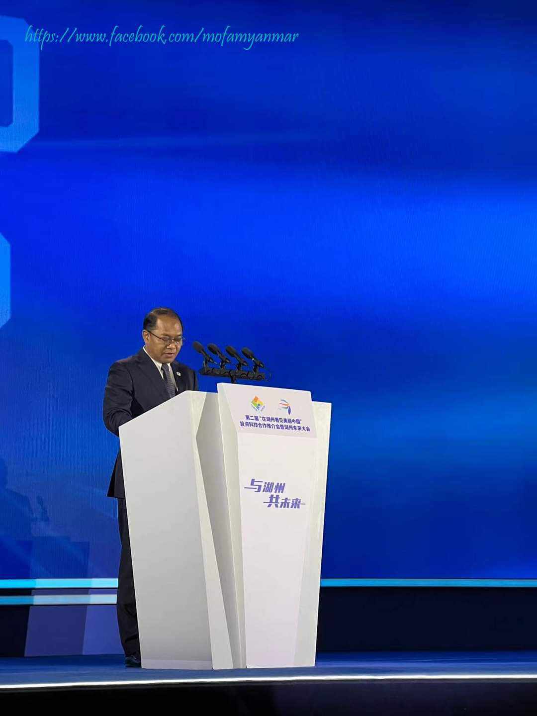 တရုတ်ပြည်သူ့သမ္မတနိုင်ငံဆိုင်ရာ မြန်မာသံအမတ်ကြီး ဦးတင်မောင်ဆွေသည် ကျဲ့ကျန်းပြည်နယ်၊ ဟူကျိုးမြို့၌ ၂၀၂၄ ခုနှစ် မေလ ၁၈ ရက်တွင် ကျင်းပခဲ့သည့် The Second Beautiful China Dynamic Huzhou Investment and Sci-tech Cooperation Conference & Huzhou Future Conference ၏ ဖွင့်ပွဲအခမ်းအနားသို့ တက်ရောက်၍ မိန့်ခွန်းပြောကြားရာတွင် အထက်ပါအတိုင်း ပြောကြားခဲ့ခြင်းဖြစ် သည်။