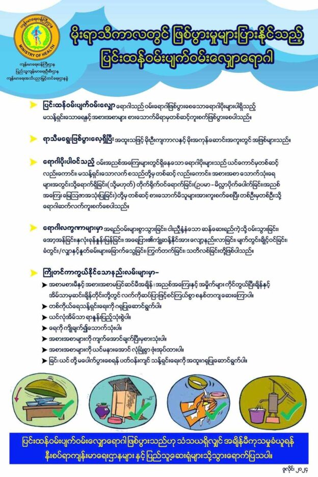 ပြင်းထန်ဝမ်းပျက်၊ ဝမ်းလျှော ရောဂါလက္ခဏာများ ခံစားရပါက နီးစပ်ရာ ကျန်းမာရေးဌာနများနှင့် ပြည်သူ့ဆေးရုံများ သို့သွားရောက်၍ စောစီးစွာ ကုသမှုခံယူသင့်ပါကြောင်း ကျန်းမာရေးဝန်ကြီးဌာနမှ အသိပေးထုတ်ပြန်ထားသည်။