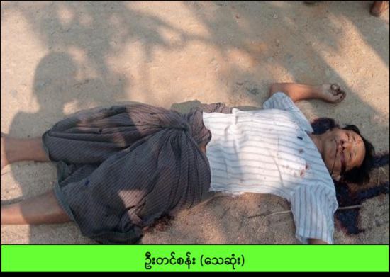 ယမန်နေ့ (ဧပြီ ၂၅) ညနေ ၆နာရီအချိန်က တောင်ငူခရိုင် ရေတာရှည်မြို့နယ် ဆွာတိုက်နယ်ဆေးရုံ၌ ကျည်ထိမှန် ဒဏ်ရာဖြင့်သေဆုံးနေသည့် အမျိုးသားအလောင်း ၁ လောင်းရောက်ရှိနေကြောင်းသတင်းအရ တာ၀န်ရှိသူများက သွားရောက်စစ်ဆေးရာ ဦးတင်စန်း(၆၆)နှစ် စစ်မှုထမ်းဟောင်း ခလရ(၂၆)အင်တိုင်းမှ တသအဆင့်ဖြင့် ဆေးဘုတ်ဖြင့်ထွက်ထားသူ ( စည်ပိုင်းကျေးရွာ ရေတာရှည်မြိုနယ်နေသူ)တွင် ဦးခေါင်းနောက်စေ့ကျည်ကြေမွဒဏ်ရာ ၁ ချက်၊ ယာနားအောက်ကျည်ဖောက်ဝင်ဒဏ်ရာ ၁ ချက်၊ ဝဲပါးကျည်ဖောက်ဝင်ဒဏ်ရာ ၁ ချက်၊ ယာပေါင် ပြတ်ရှဒဏ်ရာ ၁ ချက်၊ ယာခြေသလုံးပြတ်ရှဒဏ်ရာ ၂ ချက်/ပွန်းခြစ်ဒဏ်ရာ ၃ ချက်၊ ယာခြေဖမိုး ပြတ်ရှဒဏ်ရာ ၁ ချက်၊ ဝဲဒူးပွန်းပဲ့ဒဏ်ရာ ၁ ချက်၊ ဝှေးစေ့ကျည်ဖောက်ဝင်ဒဏ်ရာ ၁ ချက် စုစုပေါင်း ဒဏ်ရာ ၁၂ ချက်ဖြင့် သေဆုံးနေသည်ကိုစစ်ဆေးတွေ့ရှိခဲ့ကြောင်း သိရသည်။