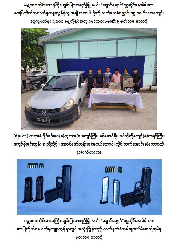 ဖြစ်စဉ်မှာ စက်တင်ဘာ ၁၀ ရက် နံနက် ၈ နာရီတွင် မန္တလေးတိုင်းဒေသကြီး ချမ်းမြသာစည်မြို့နယ် မြို့သစ် (၁) ရပ်ကွက်၊ ၇၁ လမ်းနှင့် ၁၀၁ (B) လမ်းထောင့်နေ 'ချောင်ချောင်' ရွှေဆိုင်ပိုင်ရှင်ဖြစ်သူ ဦးရွှေဝင်း (၅၇) နှစ် (ဘ) ဦးဝမ်ချောင်သည် ၎င်းဖွင့်လှစ်ထားသည့် မန္တလေးမြို့အတွင်းရှိ 'ချောင် ချောင်'ရွှေဆိုင်သုံးဆိုင်သို့ သွားရောက်ရန် ရွှေထည်ပစ္စည်းများနှင့် ငွေသားများအား ကားပေါ်သို့ တင်နေစဉ် 3J/8313 ADVAN အမျိုးအစားမော်တော်ယာဉ်ဖြင့် အမျိုးသားခြောက်ဦး (စိစစ်ဆဲ)က သေနတ်များ ကိုင်ဆောင်ကာ ရောက်ရှိလာပြီး ရွှေ ၁၀ ပိဿာကျော်နှင့် ငွေကျပ်သိန်း ၁၀၀၀ ခန့်တို့အား ဓားပြတိုက်လုယက်ယူဆောင် ထွက်ပြေးသွားကြောင်း သတင်းအရ တရားခံများအား ဖော်ထုတ်ဖမ်းဆီးနိုင်ရေး ချမ်းမြသာစည်မြို့နယ် အမှတ် (၁၁) နယ်မြေရဲ စခန်း (ပ)၂၂၀/၂၀၂၄ ရာဇသတ်ကြီးပုဒ်မ ၃၉၅ ဖြင့် အမှုရေးဖွင့်ဆောင်ရွက်ခဲ့သည်။