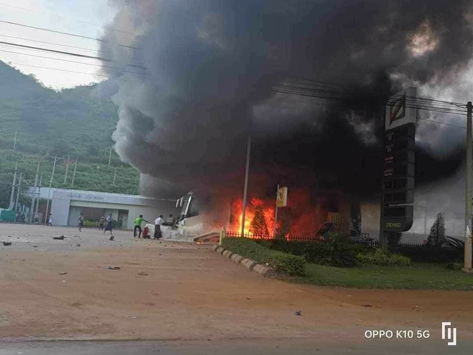 ယနေ့ ညနေ (၅) နာရီဝန်းကျင်က Denko စက်သုံးဆီအရောင်းဆိုင်အတွင်း ဆိုင်ကယ်တစ်စီးမှ တစ်ဆင့်ပေါက်ကွဲခဲ့ကြောင်းကနဦး သိရှိရပြီး၊ ဘေး၌ ဆီဖြည့်နေသည့် မူဆယ်-နေပြည်တော်ပြေးဆွဲသည့် သစ္စဟိဏ်း Express ယာဉ်အား မီးကူးစက်လောင်ကျွမ်းခဲ့ခြင်း ဖြစ်ကြောင်း သိရသည်။
