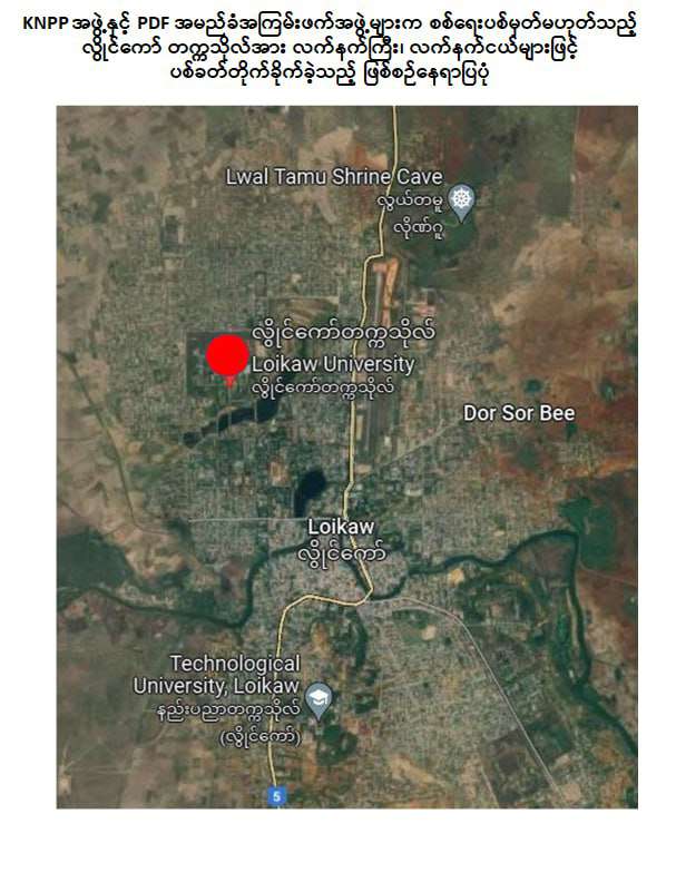 "လွိုင်ကော်မှာတော့ မနက် ၈ နာရီလောက်က KNPP နဲ့ PDF တွေအနေနဲ့ စစ်ရေးနဲ့ မသက်ဆိုင်တဲ့ လွိုင်ကော်တက္ကသိုလ်ကို လက်နက်ကြီး၊ လက်နက်ငယ်တွေနဲ့ လာရောက်ပစ်ခတ်ခဲ့တာရှိတယ်။ အထဲမှာရှိနေတဲ့ ပညာရေးဝန်ထမ်းတွေ၊ ကျောင်းသား၊ ကျောင်းသူတွေကို အတင်းအဓမ္မဖမ်းဆီးခေါ် ဆောင်ဖို့ လုပ်ခဲ့တာရှိတယ်။ ဒါတွေကိုတော့ နယ်မြေခံလုံခြုံရေး တပ်ဖွဲ့ဝင်တွေက တက္ကသိုလ်က ဆရာ၊ ဆရာမတွေ ကျောင်းသား၊ ကျောင်းသူတွေ ထိခိုက်ဒဏ်ရာ ရရှိမှုမရှိစေရေး ဘေးကင်းလုံခြုံစေရေးတွက် သူတို့ပို့ဆောင်ရေး၊ ဘေးကင်းရာနေရာများကို ပို့ဆောင်ရေး ဆောင်ရွက်လျက်ရှိတယ်။