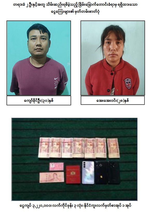 အကြမ်းဖက်သမားအယောင်ဆောင်ကာ စီးပွားရေးလုပ်ငန်းရှင် ၂၇ ဦးအား ခြိမ်းခြောက် ငွေကြေးတောင်းခံနေသူနှစ်ဦးအား ဖမ်းဆီးရမိခဲ့ကြောင်း နိုင်ငံတော် စီမံအုပ်ချုပ်ရေးကောင်စီ သတင်းထုတ်ပြန်ရေးအဖွဲ့၏ ထုတ်ပြန်ချက်အရ သိရသည်။