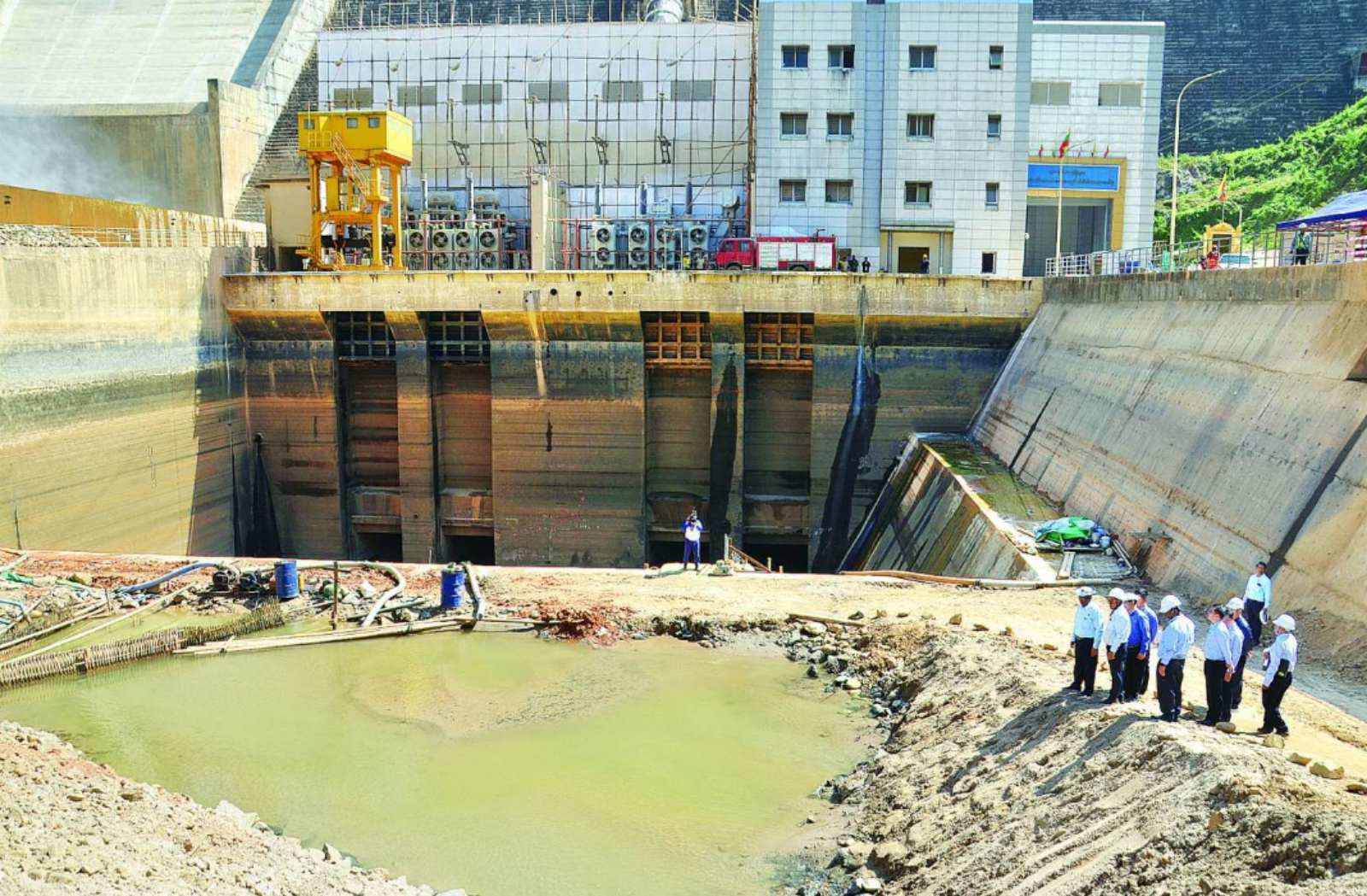 စက်ရုံအတွင်းသို့ ရေဝင်ရောက်ခဲ့သည့်အရှိန်ကြောင့် စက်ရုံရေထွက်မြောင်း (Tailrace Channel) နှင့် ခရုပတ်ခွေ (Spiral Casing) များအတွင်း ရွှံ့ညွန်သဲနုန်းနှင့် ကျောက်တုံးများ ဝင်ရောက် ပိတ်ဆို့မှု ဖြစ်ပေါ်ခဲ့သဖြင့် ရေထွက်မြောင်းရှေ့တွင် ယာယီရေတားတမံတည်ဆောက်ခြင်း၊ ရေထွက် မြောင်းအတွင်းမှ ရေများကို အင်ဂျင်တပ်ရေ စုပ်ပန့်များဖြင့် စုပ်ယူ၍ ရေစစ်ကန်သို့ပေးပို့ခြင်း၊ ရေစစ်ကန်မှ ယာယီရေ တားတမံအပြင်သို့ စွန့်ထုတ်ခြင်းဆောင်ရွက်ခဲ့ပြီး ရေထွက်ပေါက်အဝရှိ ရွှံ့ညွန်သဲနုန်းနှင့် ကျောက်တုံးများကို လူအင်အားဖြင့် ခက်ခက်ခဲခဲရှင်းလင်း တူးထုတ်ခဲ့ရကြောင်း သိရသည်။