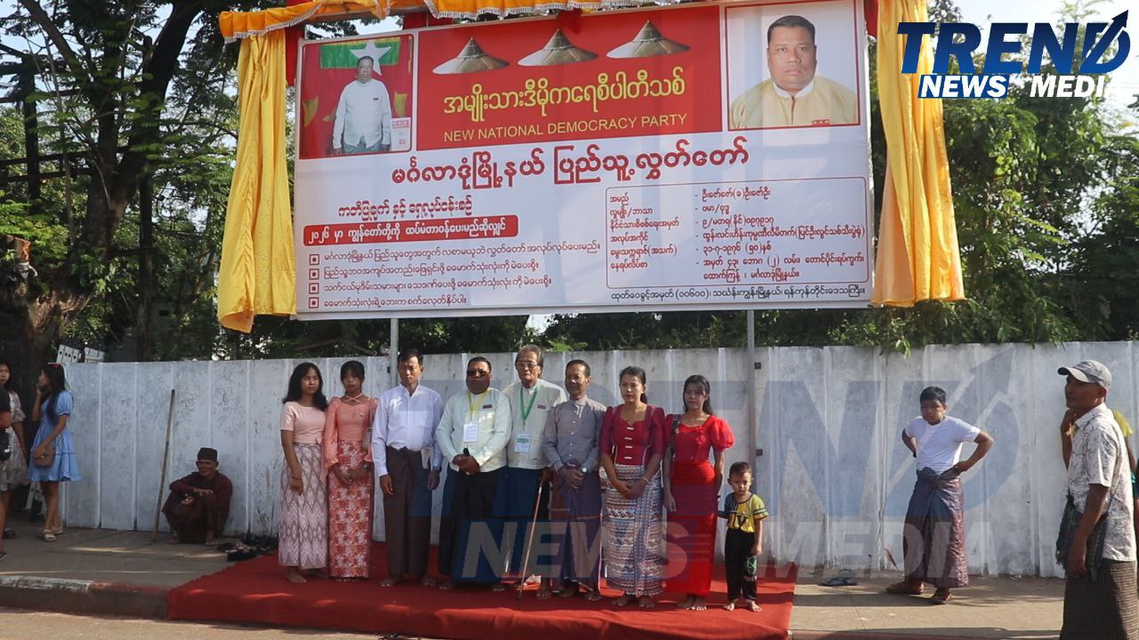 အမျိုးသားဒီမိုကရေစီပါတီသစ်ပါတီ၏ အောင်နိုင်ရေး ဆိုင်းဘုတ်စိုက်ထူခြင်း အခမ်းအနားကို ဒီဇင်ဘာ ၇ ရက်နေ့တွင် မင်္ဂလာဒုံမြို့နယ်၊ ထောက်ကြံ့လမ်းဆုံ၌ ကျင်းပပြုလုပ်ခဲ့သည်။