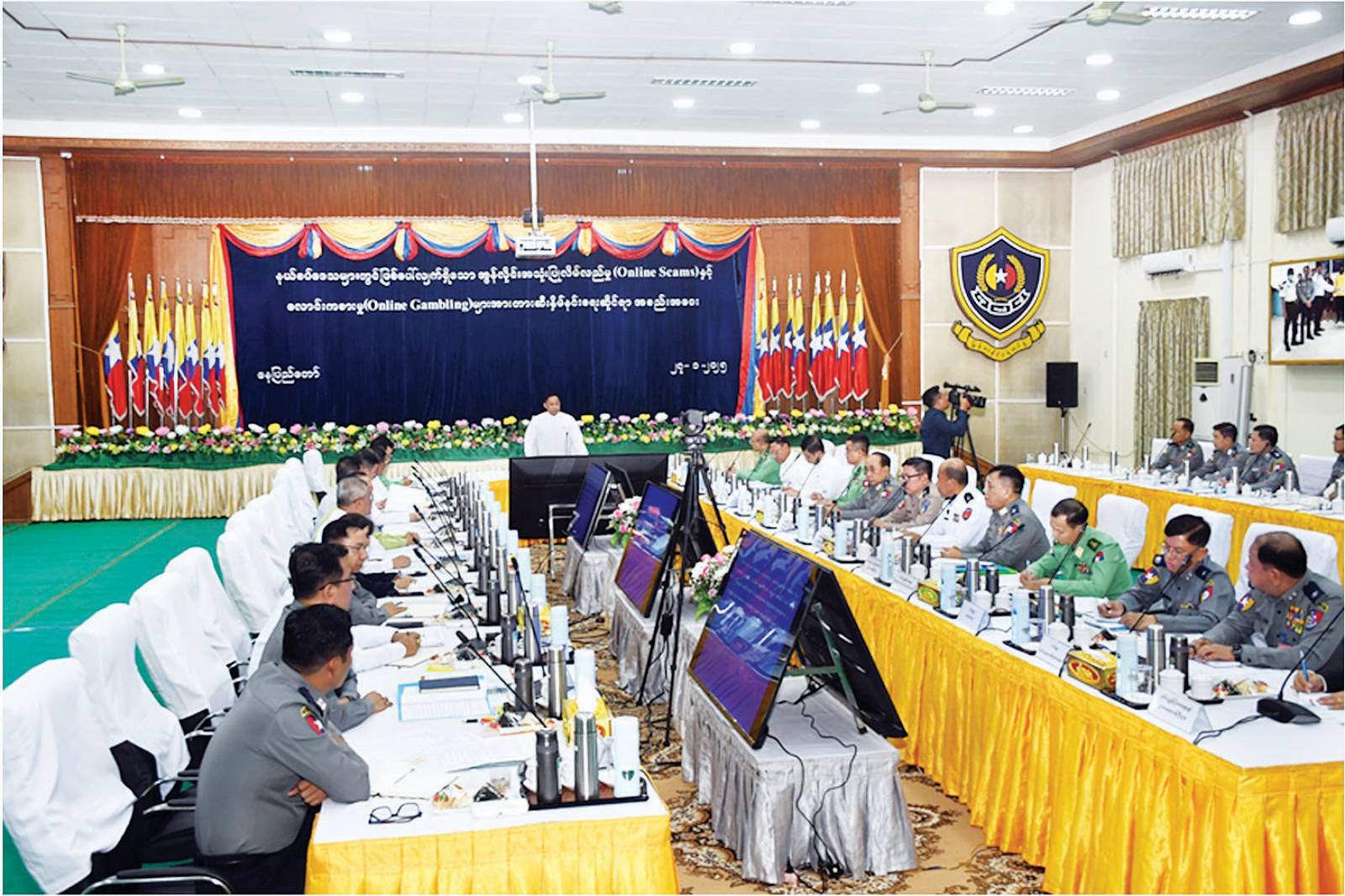 နယ်စပ်ဒေသများတွင် ဖြစ်ပေါ်လျက်ရှိသော အွန်လိုင်း အသုံးပြုလိမ်လည်မှု (Online Scam)နှင့် လောင်းကစားမှု(Online Gambling)များအား တားဆီး နှိမ်နင်းရေးဆိုင်ရာ အစည်းအဝေးကို မြန်မာနိုင်ငံရဲ တပ်ဖွဲ့ဌာနချုပ်တွင် ကျင်းပခဲ့ရာ အထက်ပါအတိုင်း ပြောကြားခဲ့ခြင်းဖြစ်သည်။