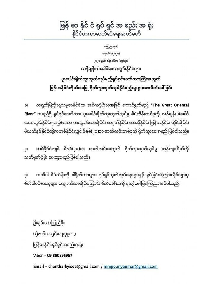 “The Great Oriental River” လန်ချန်း - မဲခေါင် ဒေသတွင်းနိုင်ငံများ ပူးပေါင်းရိုက်ကူးထုတ်လုပ်မည့် ရုပ်ရှင်ဇာတ်ကားကြီးအတွက် မြန်မာနိုင်ငံကိုယ်စားပြု ရိုက်ကူးထုတ်လုပ်မည့်သူများကို ဖိတ်ခေါ်ထားကြောင်း မြန်မာနိုင်ငံ ရုပ်ရှင်အစည်းအရုံးက အသိပေးထားသည်။