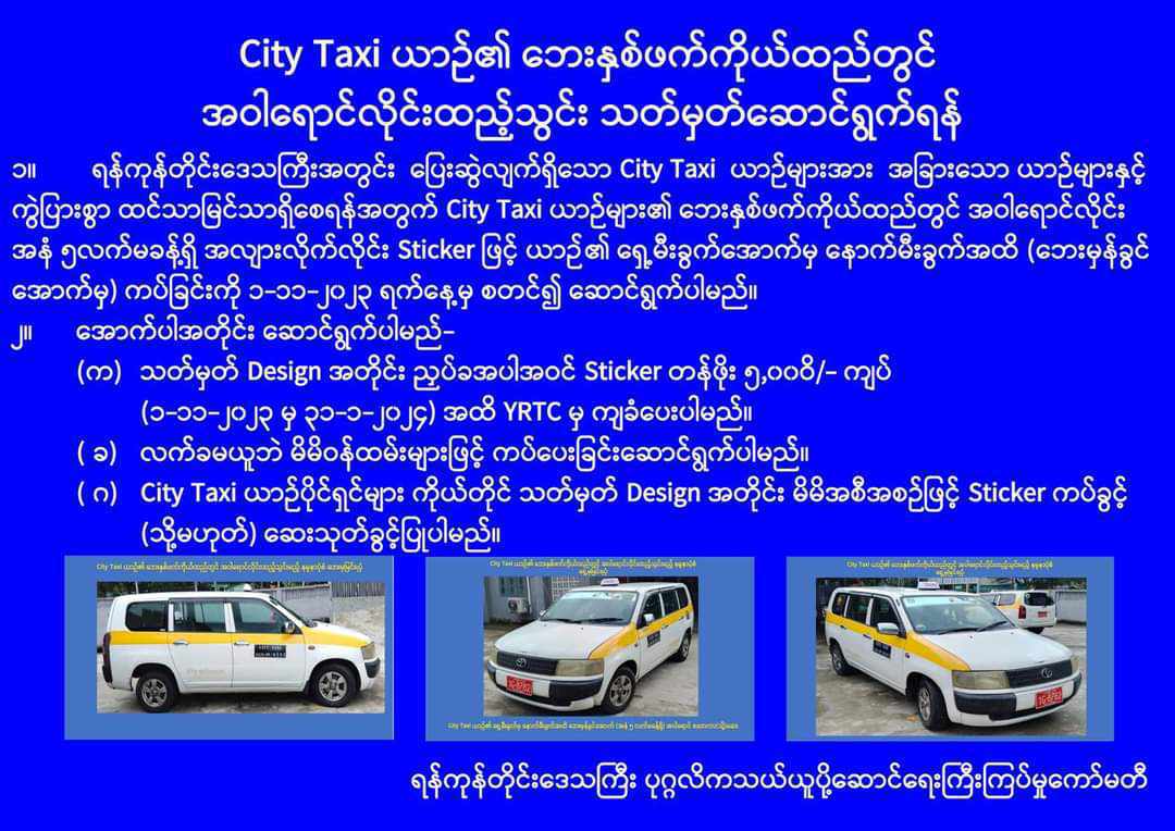 ရန်ကုန်တိုင်းဒေသကြီးအတွင်း ပြေးဆွဲလျက်ရှိသော City Taxi ယာဉ်များအား အခြားသော ယာဉ်များနှင့်ကွဲပြားသော ထင်သာမြင်သာရှိစေရန်အတွက် City Taxi ယာဉ်များ၏ ဘေးနှစ်ဖက်ကိုယ် ထည်တွင် အဝါရောင်လိုင်း အနံငါးလက်မခန့်ရှိ အလျားလိုက်လိုင်း Sticker ဖြင့် ယာဉ်၏ရှေ့မီးခွက် အောက်မှ နောက်မီးခွက်အထိ (ဘေး မှန်ခွင်အောက်မှ)ကပ်ခြင်းကို နိုဝင်ဘာလ ၁ ရက်မှစတင်၍ ဆောင်ရွက်မည်ဟု ရန် ကုန်တိုင်းဒေသကြီး ပုဂ္ဂလိက သယ်ယူပို့ ဆောင်ရေးကြီးကြပ်မှုကော်မတီ YRTC