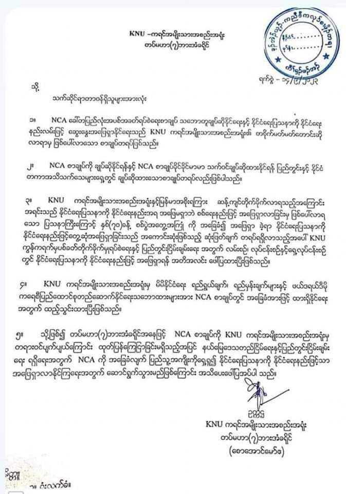 NCA စာချုပ်ကို KNU ကရင်အမျိုးသားအစည်းအရုံးမှ တရားဝင်ပျက်ပျယ်ကြောင်း ထုတ်ပြန်ကြေငြာခြင်းမရှိသည့်အပြင် နယ်မြေဒေသ တည်ငြိမ်ရေးနှင့် ပြည်တွင်းငြိမ်း ချမ်းရေး ရရှိရေးအတွက် NCA ကို အခြေခံလျက် ပြည်သူ့အကျိုးကိုရှေ့ရှု၍ နိုင်ငံရေးပြဿနာကို နိုင်ငံရေးနည်းဖြင့်သာအဖြေရှာလာနိုင်ကြရေးအတွက် ဆောင်ရွက်သွားမည်ဟု KNU ကရင်အမျိုးသားအစည်းအရုံး၊ တပ်မဟာ (၇) ဘားအံခရိုင်မှ စက်တင်ဘာ ၁၄ ရက်နေ့က ထုတ်ပြန်ထားသည်။