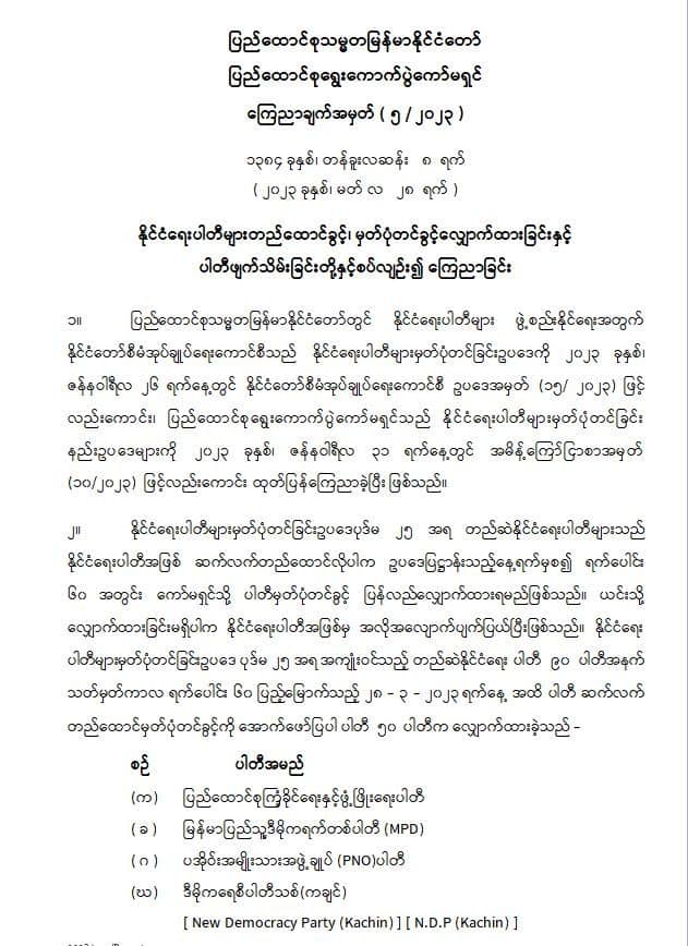 အမျိုးသားဒီမိုကရေစီအဖွဲ့ချုပ် (NLD) ၊ ရှမ်းတိုင်းရင်း သားများ ဒီမိုကရေစီအဖွဲ့ချုပ် (SNLD) အပါအ၀င် သတ်မှတ်ကာလအတွင်း လျှောက်ထားခြင်းမရှိသည့် နိုင်ငံရေးပါတီ ၄၀ ပါတီတို့ကို နိုင်ငံရေးပါတီအဖြစ်မှ အလိုအလျောက် ပျက်ပြယ်ပြီးဖြစ် ယင်းပါတီများကို ၂၉ - ၃ - ၂၀၂၃ ရက်နေ့မှစ၍ နိုင်ငံရေးပါတီအဖြစ် မှတ်ပုံတင်ထားခြင်းမှ ပယ် ဖျက်၍ ပါတီများအား ဖျက်သိမ်းလိုက်ကြောင်း ပြည်ထောင်စုရွေးကောက်ပွဲကော်မရှင်က ကြေ ညာချက်အမှတ် ( ၅ / ၂၀၂၃ ) ဖြင့် ယနေ့(မတ် ၂၈) ထုတ်ပြန်လိုက်သည်။