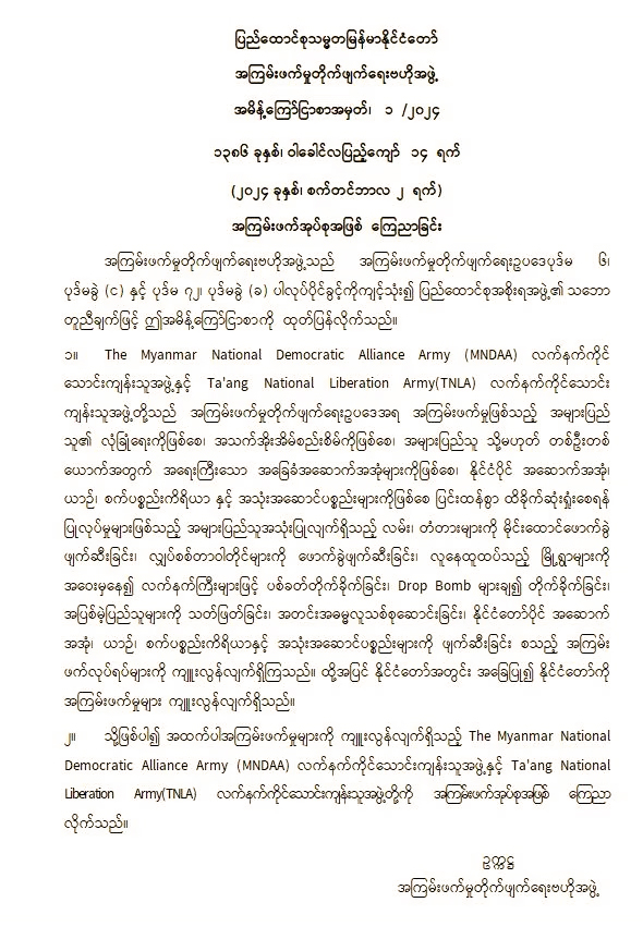 အဆိုပါ အမိန့်ကြော်ငြာစာတွင် The Myanmar National Democratic Alliance Army (MNDAA) လက်နက်ကိုင် သောင်းကျန်းသူအဖွဲ့နှင့် Ta'ang National Liberation Army(TNLA) လက်နက်ကိုင် သောင်းကျန်းသူအဖွဲ့တို့သည် အကြမ်းဖက်မှု တိုက်ဖျက်ရေးဥပဒေအရ အကြမ်းဖက်မှုဖြစ်သည့် အများပြည်သူ၏ လုံခြုံရေးကိုဖြစ်စေ၊ အသက်အိုးအိမ်စည်းစိမ်ကိုဖြစ်စေ၊ အများပြည်သူ သို့မဟုတ် တစ်ဦးတစ်ယောက်အတွက် အရေးကြီး သော အခြေခံအဆောက် အအုံများကိုဖြစ်စေ၊ နိုင်ငံပိုင်အဆောက်အအုံ၊ ယာဉ်၊ စက်ပစ္စည်းကိရိယာနှင့် အသုံးအ ဆောင်ပစ္စည်းများကိုဖြစ်စေ ပြင်းထန်စွာ ထိခိုက်ဆုံးရှုံးစေရန် ပြုလုပ်မှုများဖြစ်သည့် အများပြည်သူ အသုံးပြုလျက်ရှိသည့် လမ်း၊ တံတားများကို မိုင်းထောင်ဖောက်ခွဲ ဖျက်ဆီးခြင်း၊ လျှပ်စစ်တာဝါတိုင်များကို ဖောက်ခွဲ ဖျက်ဆီးခြင်း၊ လူနေထူထပ်သည့် မြို့ရွာများ ကို အဝေးမှနေ၍ လက်နက်ကြီးများဖြင့် ပစ်ခတ်တိုက်ခိုက်ခြင်း၊ Drop Bomb များချ၍ တိုက်ခိုက်ခြင်း၊ အပြစ်မဲ့ပြည်သူများကို သတ်ဖြတ်ခြင်း၊ အတင်းအဓမ္မလူသစ်စု ဆောင်းခြင်း၊ နိုင်ငံတော်ပိုင် အဆောက်အအုံ၊ ယာဉ်၊ စက်ပစ္စည်းကိရိယာနှင့် အသုံးအဆောင်ပစ္စည်းများကို ဖျက်ဆီးခြင်းစသည့် အကြမ်းဖက်လုပ်ရပ်များကို ကျူးလွန်လျက် ရှိကြသည်။ ထို့အပြင် နိုင်ငံတော်အတွင်း အခြေပြု၍ နိုင်ငံတော်ကို အကြမ်းဖက်မှုများ ကျူးလွန်လျက်ရှိရာ အဆိုပါလက်နက်ကိုင် သောင်းကျန်းသူအဖွဲ့တို့ကို အကြမ်းဖက်အုပ် စုအဖြစ် ကြေညာလိုက်ကြောင်း သိရသည်။