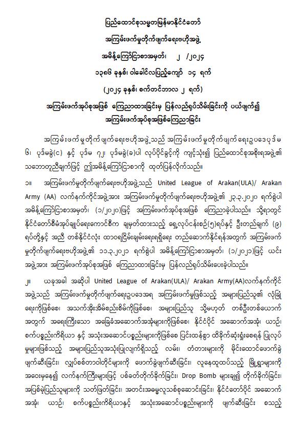 အဆိုပါ United League of Arakan (ULA)? Arakan Army (AA) လက် နက်ကိုင်အဖွဲ့သည် အကြမ်း ဖက်မှုတိုက်ဖျက် ရေးဥပဒေအရ အကြမ်းဖက်မှုဖြစ်သည့် အများပြည်သူ၏ လုံခြုံရေးကိုဖြစ်စေ၊ အသက် အိုးအိမ် စည်းစိမ်ကိုဖြစ်စေ၊ အများပြည်သူ သို့မဟုတ် တစ်ဦးတစ်ယောက်အတွက် အရေးကြီးသော အခြေခံအဆောက်အအုံများ ကိုဖြစ်စေ၊ နိုင်ငံပိုင်အဆောက်အအုံ၊ ယာဉ်၊ စက်ပစ္စည်းကိရိယာနှင့် အသုံးအဆောင် ပစ္စည်းများကိုဖြစ်စေ ပြင်းထန်စွာ ထိခိုက်ဆုံးရှုံးစေရန် ပြုလုပ်မှုများဖြစ်သည့် အများပြည်သူ အသုံးပြုလျက်ရှိသည့် လမ်း၊ တံတားများကို မိုင်းထောင်ဖောက်ခွဲ ဖျက်ဆီးခြင်း၊ လျှပ်စစ်တာဝါတိုင်များကို ဖောက်ခွဲဖျက်ဆီးခြင်း၊ လူနေထူထပ်သည့် မြို့ရွာများ ကို အဝေးမှနေ၍ လက်နက်ကြီးများဖြင့် ပစ်ခတ်တိုက်ခိုက်ခြင်း၊ Drop Bomb များချ၍ တိုက်ခိုက်ခြင်း၊ အပြစ်မဲ့ပြည်သူများကို သတ် ဖြတ်ခြင်း၊ အတင်းအဓမ္မ လူသစ်စုဆောင်းခြင်း၊ နိုင်ငံတော်ပိုင် အဆောက်အအုံ၊ ယာဉ်၊ စက်ပစ္စည်းကိရိယာနှင့် အသုံးအဆောင်ပစ္စည်းများကို ဖျက်ဆီးခြင်း စသည့် အကြမ်း ဖက်လုပ်ရပ်များကို ပြန်လည်ကျူး လွန်လာခဲ့သည့်အပြင် နိုင်ငံတော်အတွင်း အခြေပြု၍ နိုင်ငံတော်ကို အကြမ်း ဖက်မှုများ ဆက်လက် ကျူးလွန်လျက်ရှိကြောင်း သိရသည်။