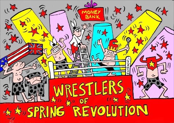တစ်ခါတလေ တော်လှန်ရေးခေါင်းဆောင်ကြီးတွေက နပန်းပွဲတွေထဲက Money Bank ဆိုသည့် ကစားပွဲတွင် ဝင်ရောက် ယှဉ်ပြိုင်ကြသော နပန်းသမားများနဲ့တောင် ဆင်တူသေးသည်။ WWE နပန်းပွဲစီ စဉ်သူက ကြိုးဝိုင်းအထက် ၁၀ ပေလောက် မြင့်သည့်နေရာတွင် ဒေါ်လာတွေ ထည့်ထားသော အိတ်တစ် လုံးကို Money Bank ဟု ရေးသားကာ ချိတ်ဆွဲထားပြီး စင်ပေါ်မှာ ခေါက်လှေကားလေးတစ်ခု ချထားပေးသည်။