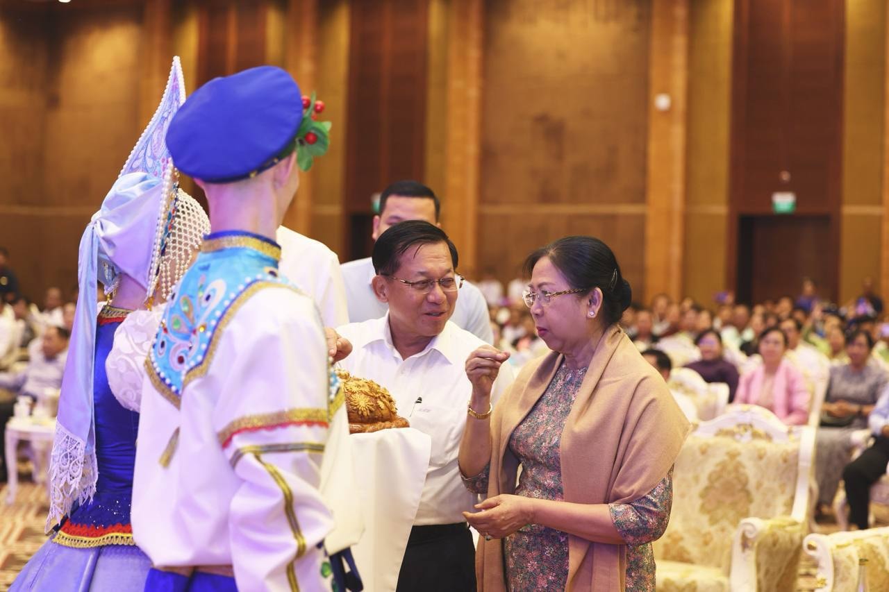 ထို့နောက် နိုင်ငံတော်ယာယီသမ္မတနိုင်ငံတော်လုံခြုံရေးနှင့်အေးချမ်းသာယာရေးကော်မရှင် ဥက္ကဋ္ဌနှင့် ဇနီး၊ တက်ရောက်လာကြသူများသည် နိုဗိုစီဗစ် Chaldony State Song and Dance Ensemble အဖွဲ့မှ အနုပညာရှင်များ၊ သာသနာရေးနှင့် ယဉ်ကျေးမှု ဝန်ကြီးဌာန၊ အနုပညာဦးစီးဌာနမှ အနုပညာရှင်များ၏ ဖျော်ဖြေတင်ဆက်မှုများကို ကြည့်ရှု အားပေးကြသည်။